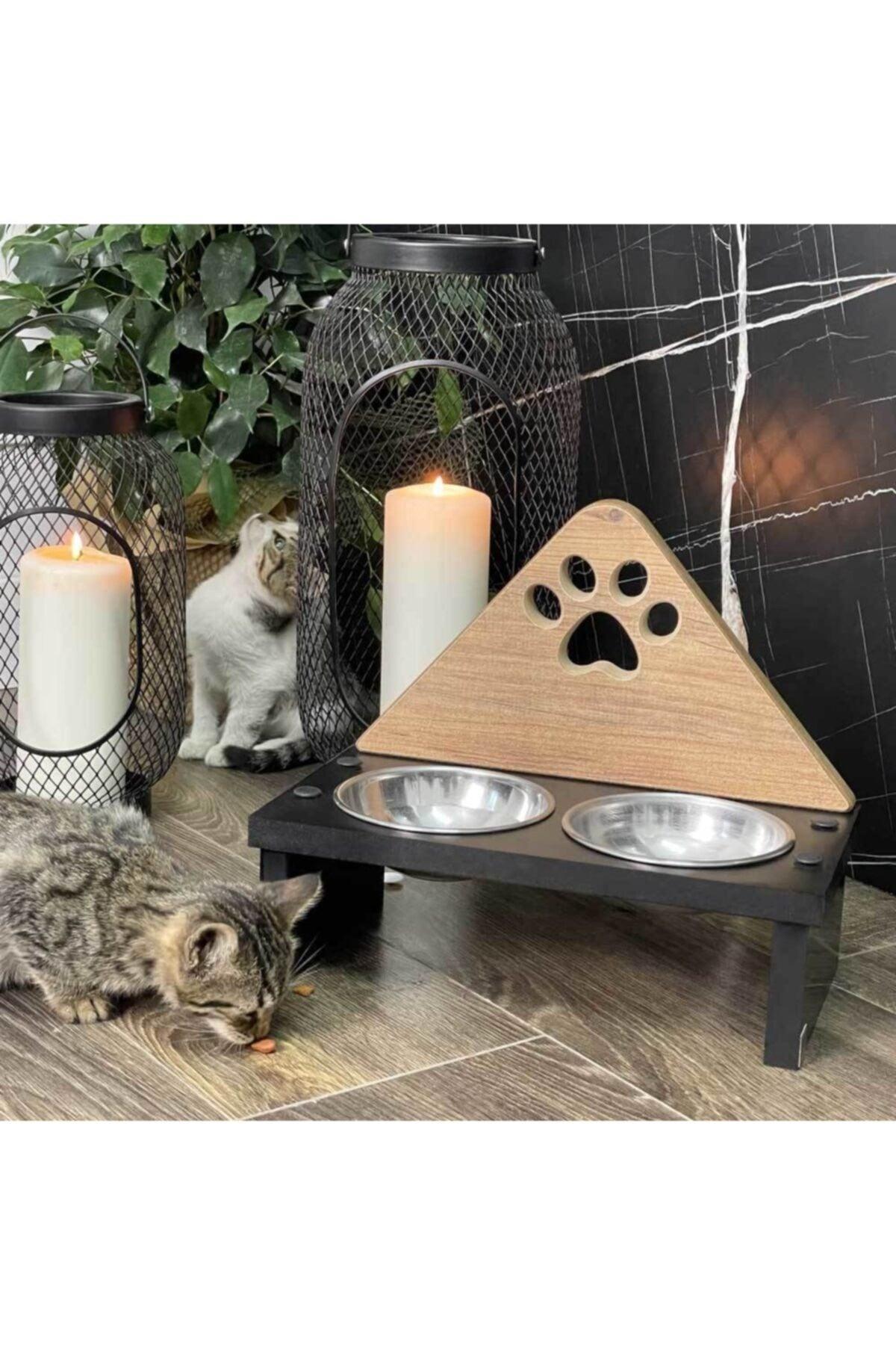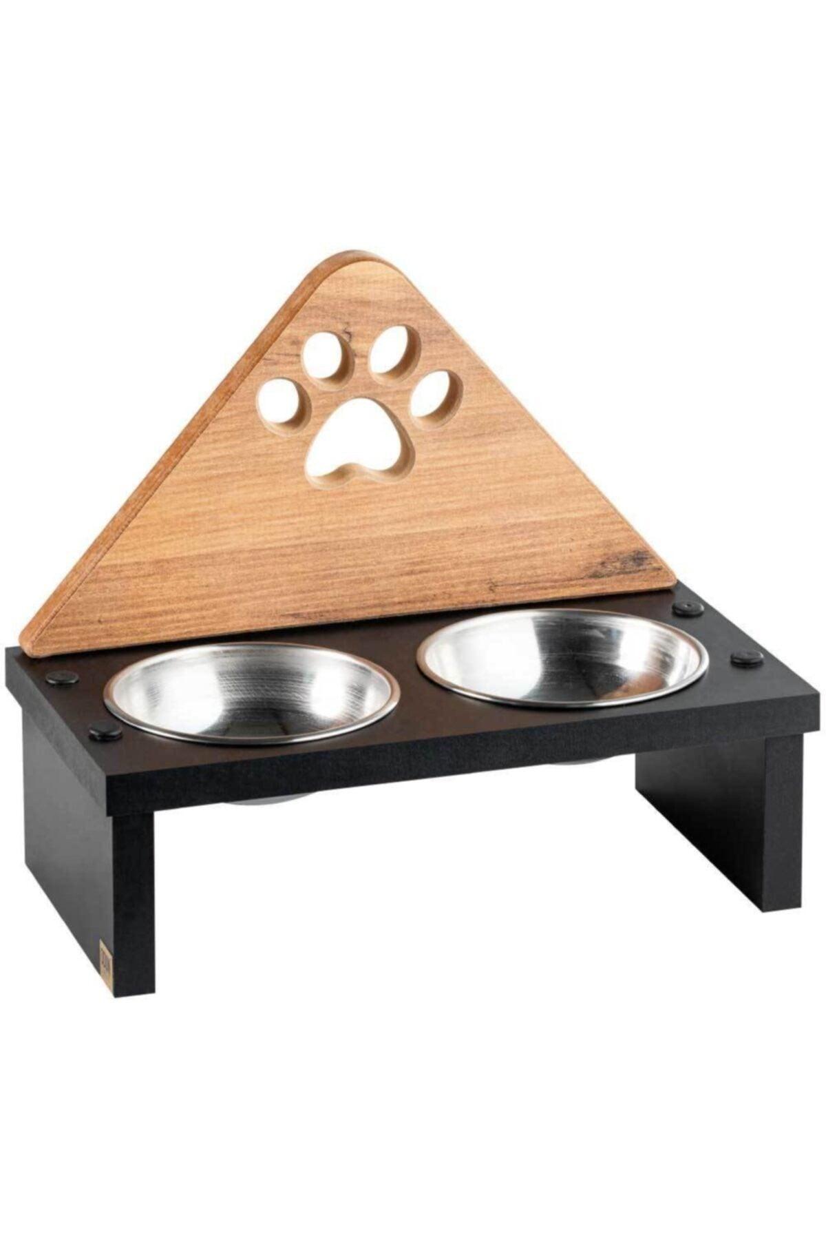 Tazón de acero de madera Minnoş Pata estampada de alimentos para un solo gato y recipiente de agua