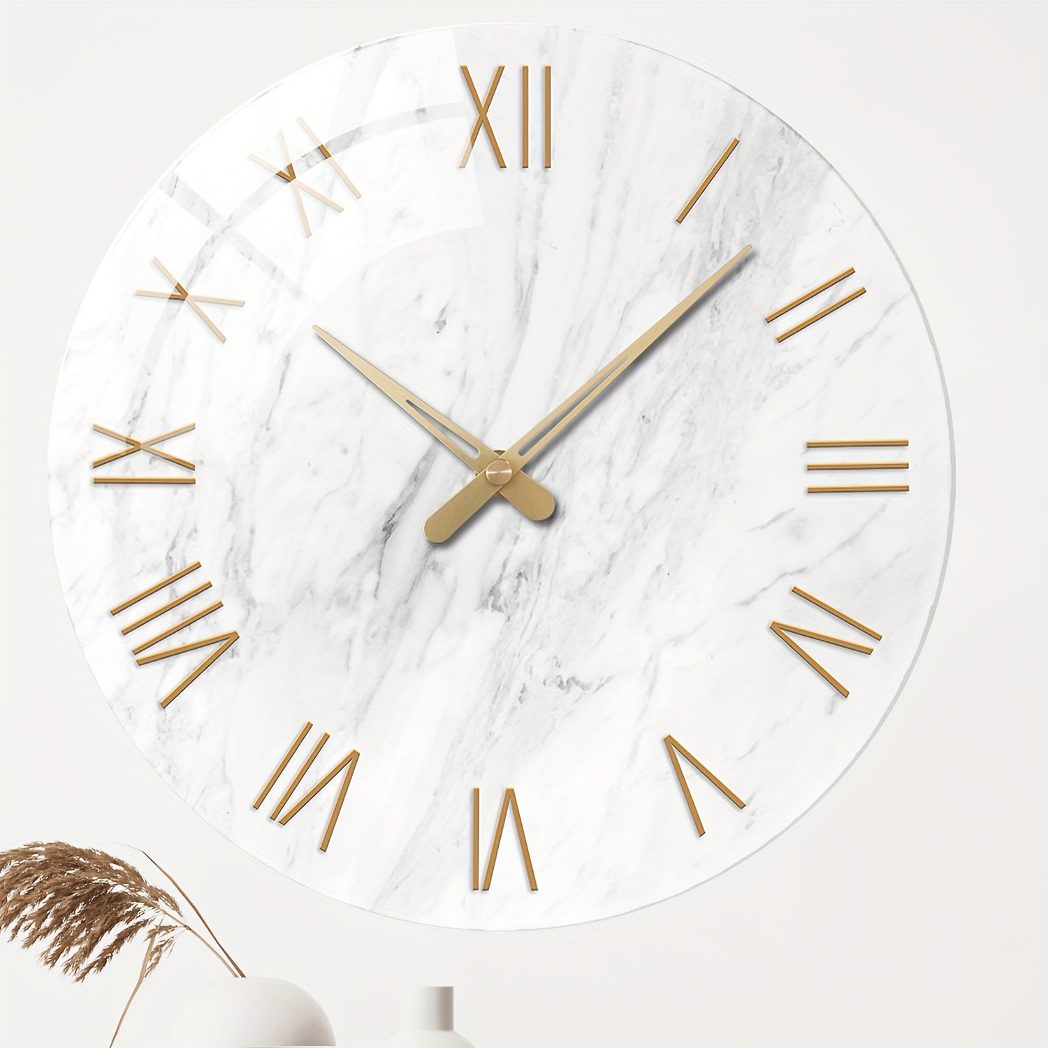 12 Inch Large Modern Marble Wall Clock - White & Golden Luxury Quartz Movement, Silent Non-Ticking Thickened Glass-Free Face, White Marble with Golden Hands & Roman Numerals - - Round Clock for, Office, Bedroom, 2D Flat