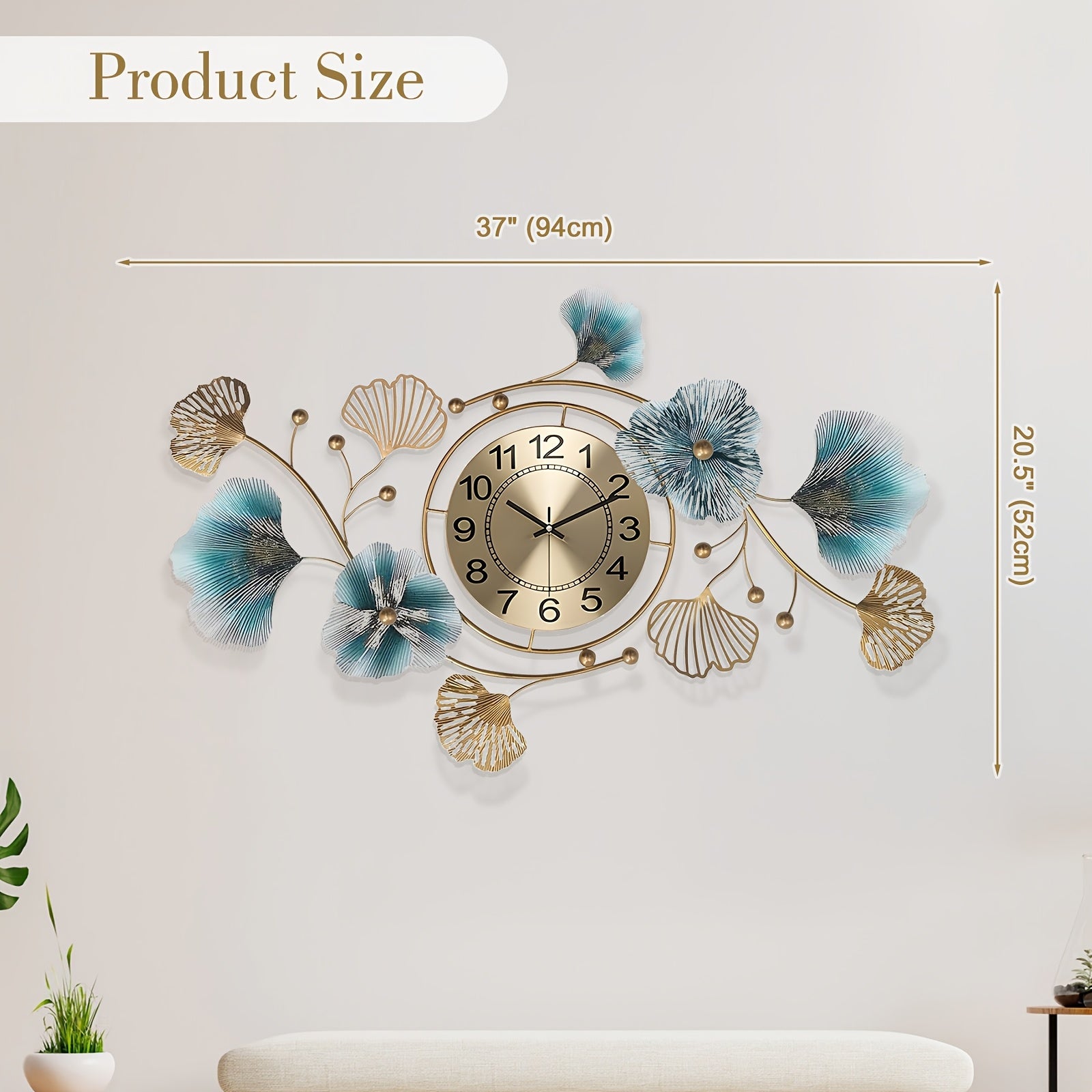 37in/47in 3D Ginkgo Leaf Wall Clock Iron Metal Leaf Wall Hanging Silent Clock, Wall Art Decoration Horizontal Vertical Art Wall Decor For Home Office Living Room Bedroom