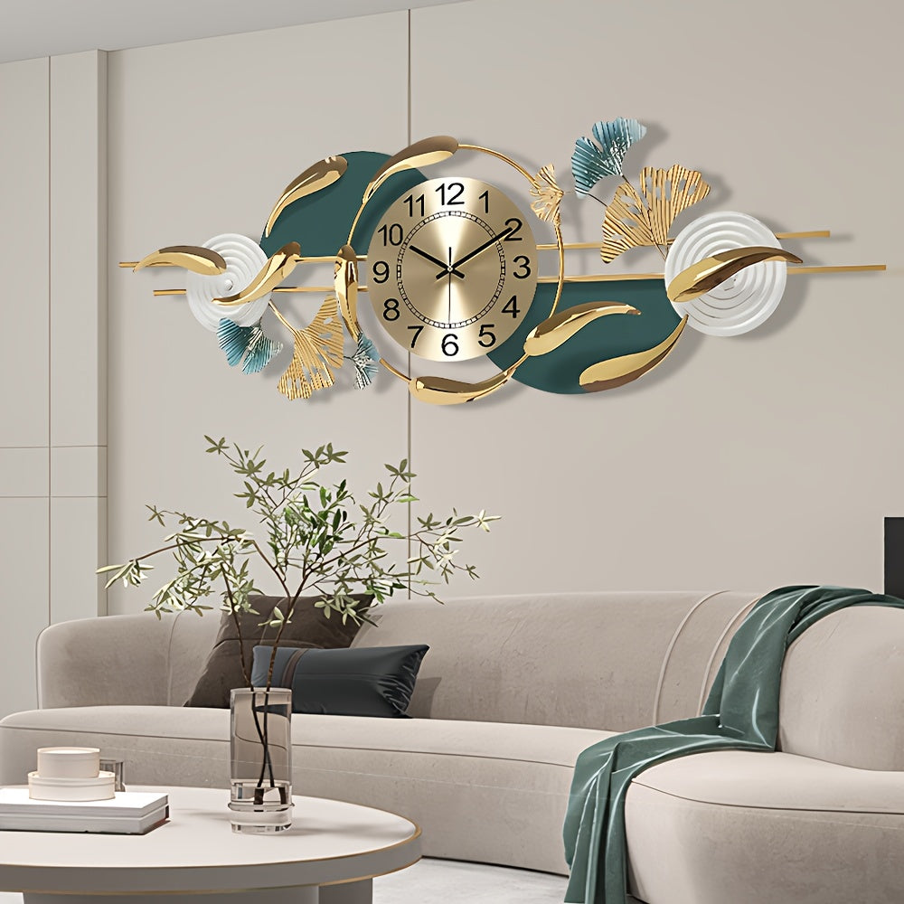 40" Large Modern Metal Wall Clock with 3D Swimming Fish & Ginkgo Leaf Design – Silent No-Tick Decorative Clock for Living Room, Kitchen, or Office – Teal & Golden Abstract Art, Horizontal Display