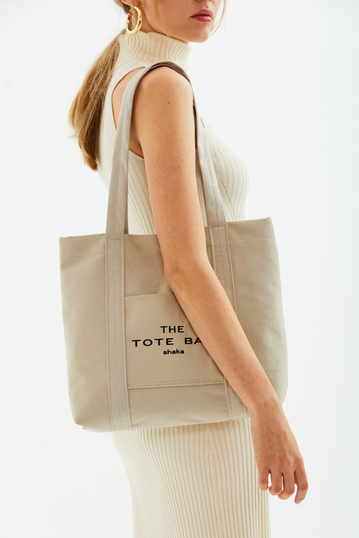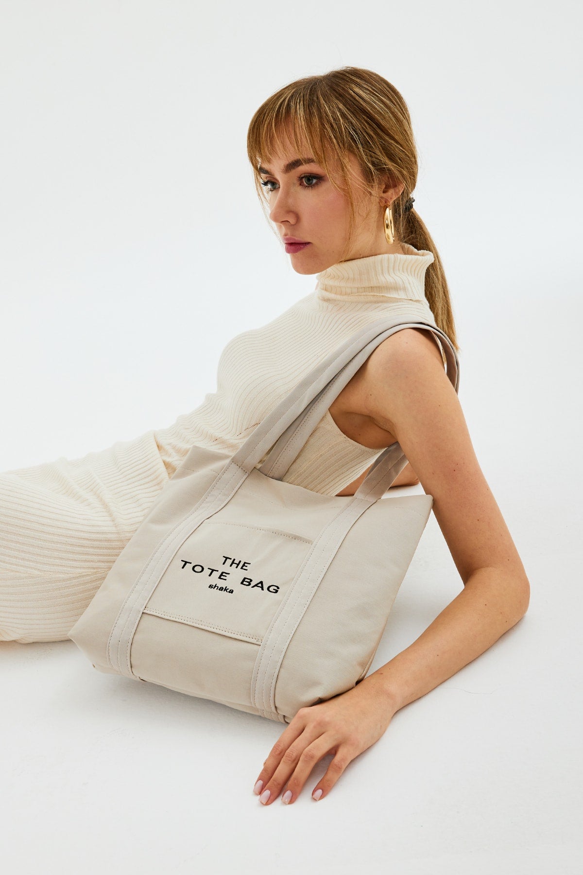Cream U46 Snap Closure Front Pocket Detailed Tote Bag Embroidered Canvas Women'S Arm And Shoulder Bag U:30 E: