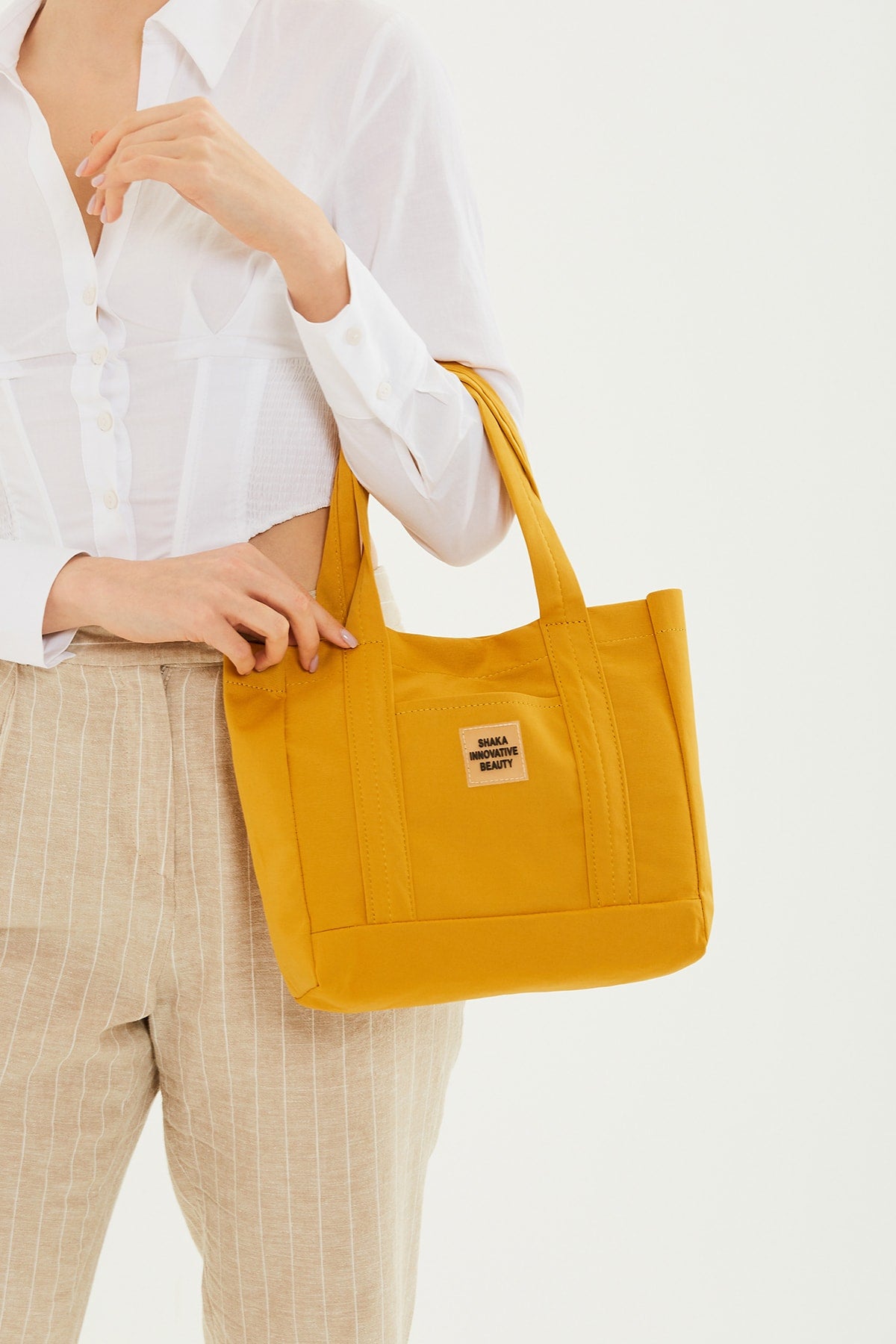 Mustard U37 Snap Closure 2 Compartment Front Pocket Detailed Canvas Fabric Daily Women'S Arm And Shoulder Bag