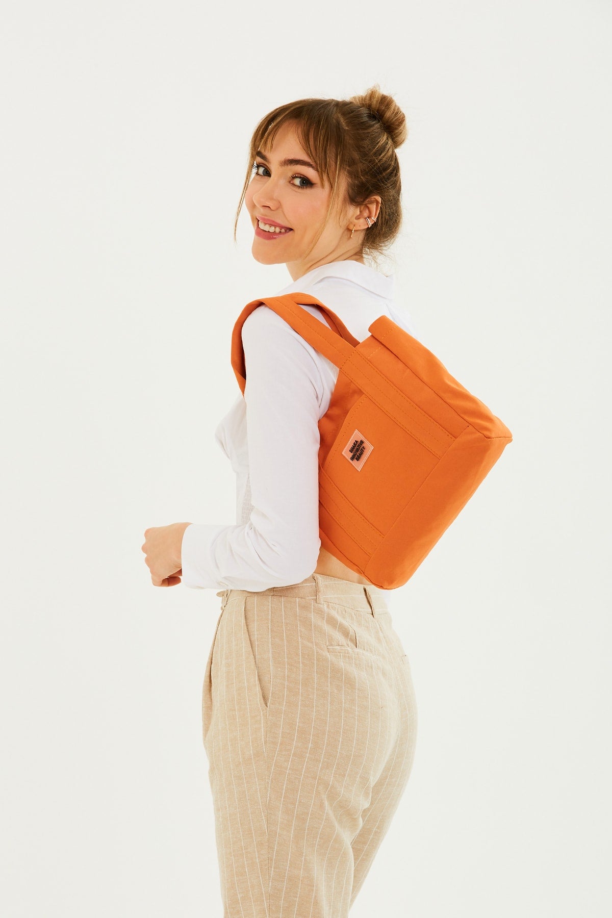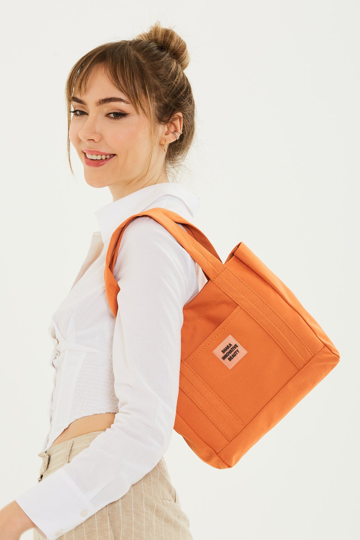 Orange U37 Snap Closure 2 Compartment Front Pocket Detailed Canvas Fabric Daily Women'S Arm And Shoulder Bag