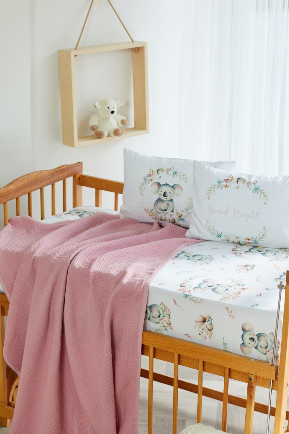Organic Muslin Picture And Cotton Satin Baby Bedding - Koala And Flower Themed