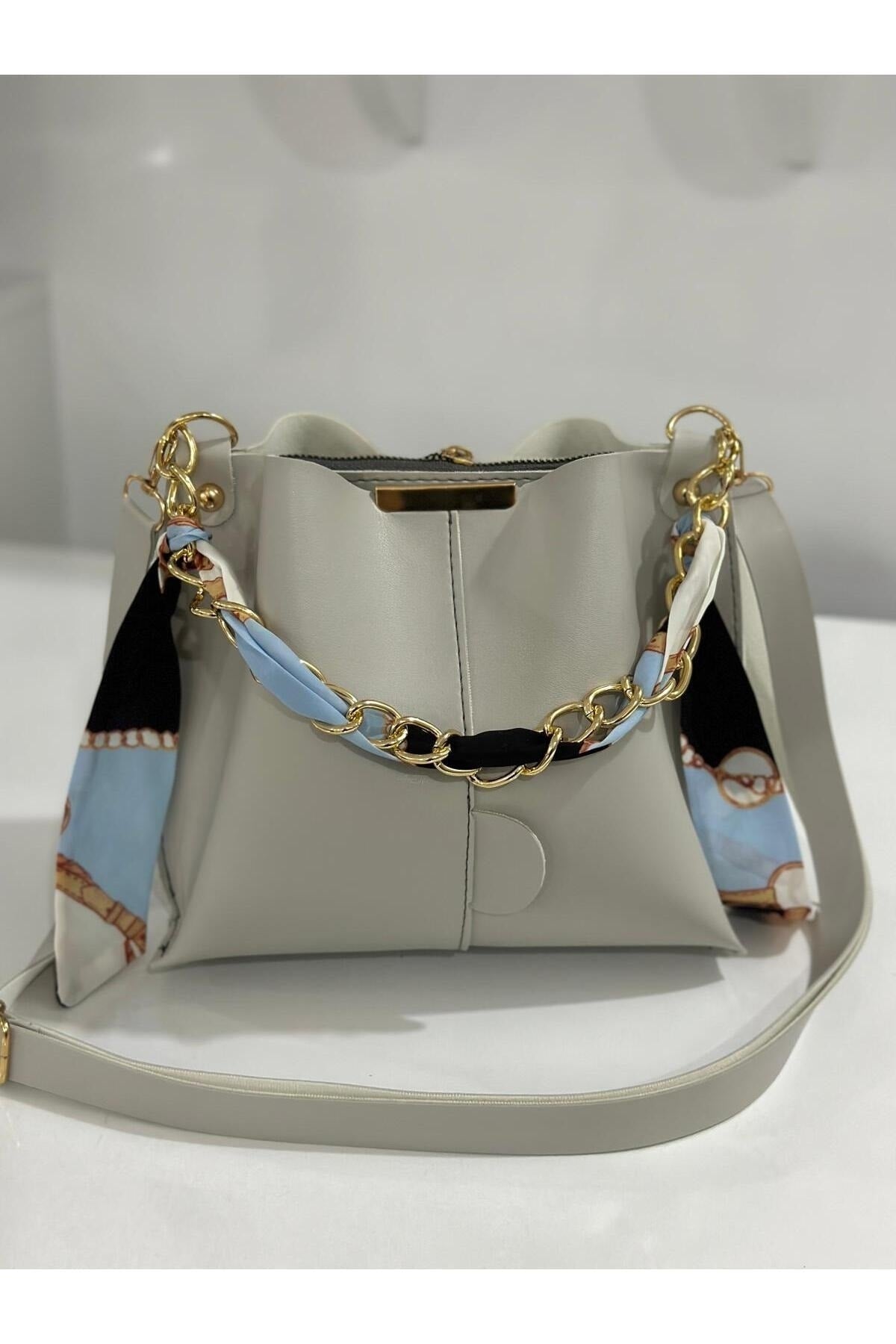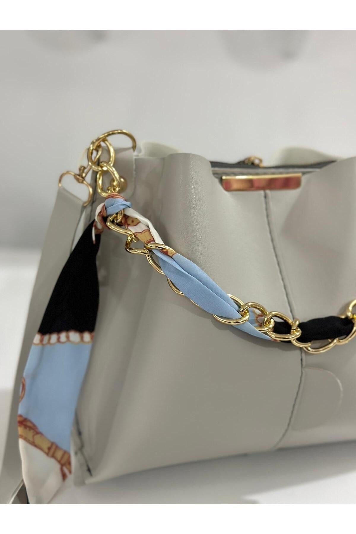 Women'S Scarf Light Gray Chain Accessory Soft Leather 3-Compartment Hand, Arm And Shoulder Bag