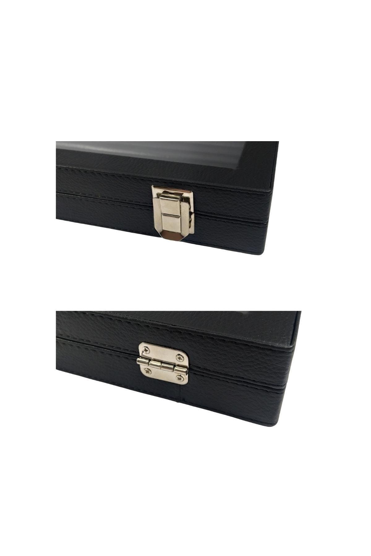 Bandeja de joyería de 20 sección con tapa de vidrio de cuero negro / negro en el interior
