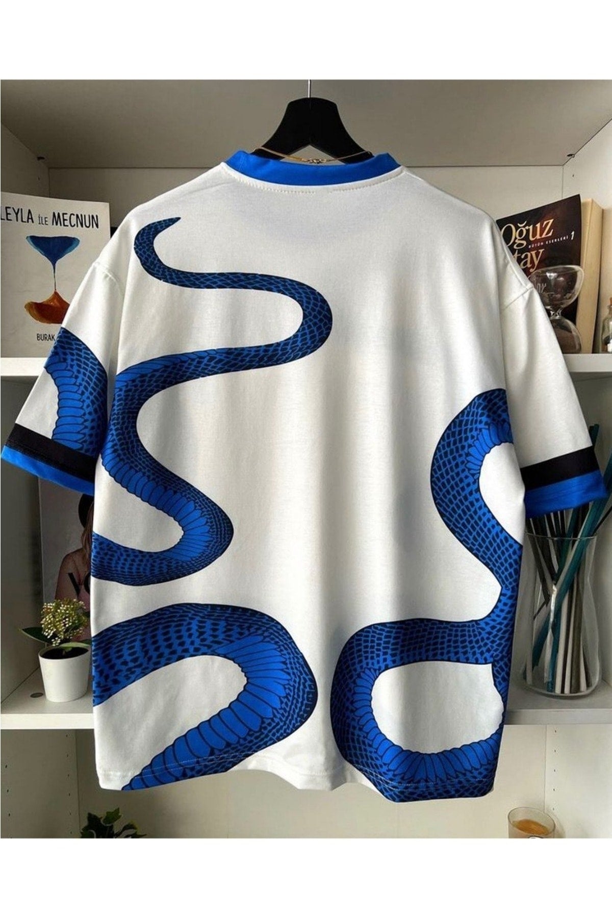 Black Sokak Men'S White Snake Patterned Inter Oversize Crew Neck Tshirt