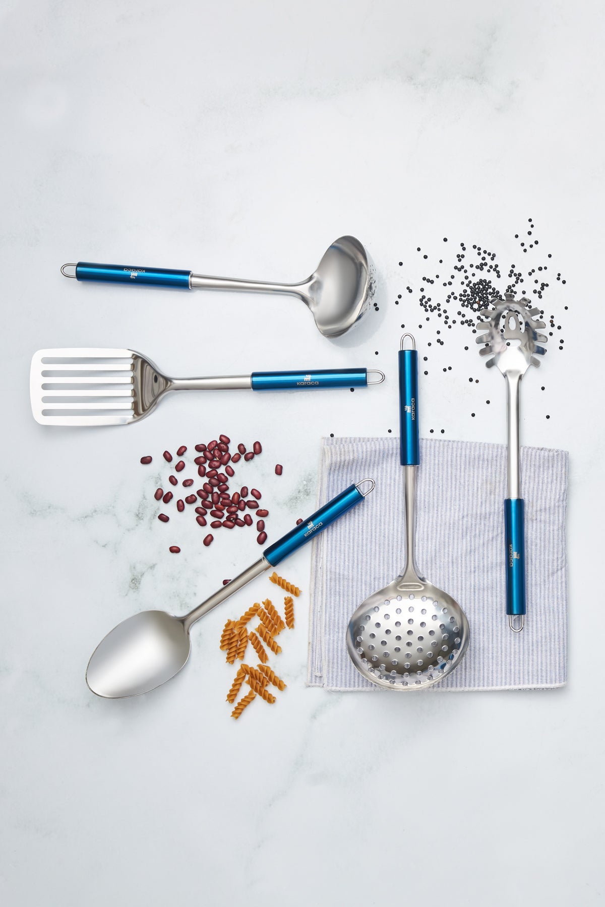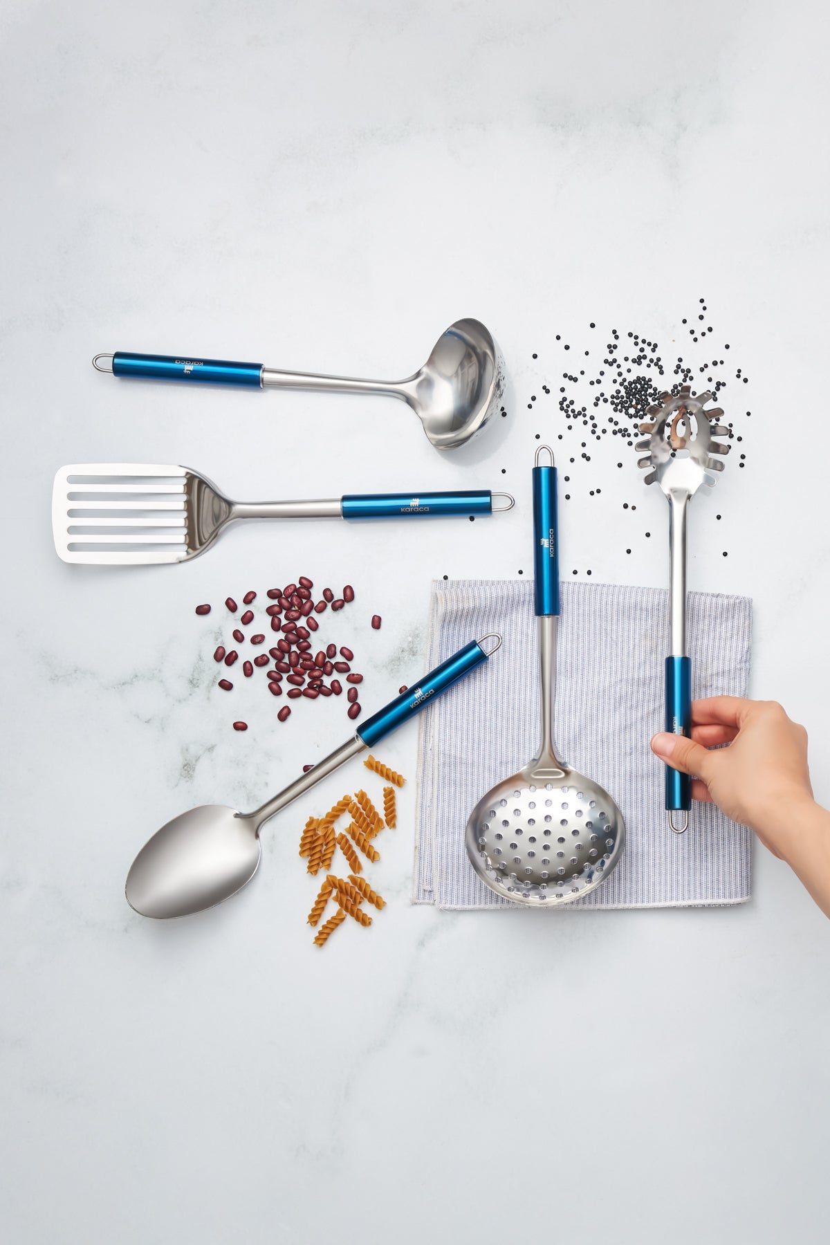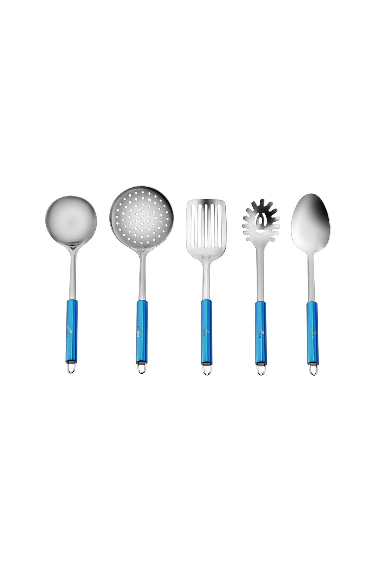 Karaca master blue 5 piece serving set set content 1 piece colander 33cm1 piece ladle 32cm1 piece slotted serving spoon 33.5cm1 piece slotted spatula 33.5cm1 piece pasta spoon 31.5cmmaterial: stainless steel karaca master 5 piece serving set features kitchen appliances are long-lasting for intense hustle and bustle. it has to last for a while. karaca master blue 5-piece serving set is produced from stainless steel, providing long-lasting use. stainless steel material has antibacterial properties. the products are stain-resistant. unlike other metals, stainless steel does not change the color, odor or taste of foods. it can also prevent contamination of toxic substances and chemicals in your food. this feature makes the serving set great for homes with large families, children, the elderly, and pets. that's why karaca products are frequently preferred in kitchens for long periods of time. the food service set includes a perforated spatula, ladle, serving spoon, colander and pasta spoon. when you purchase the karaca serving set, you get a product set suitable for versatile use at once. you can enliven your tables with the elegance of the set while presenting all kinds of dishes. Improved version for clearer understanding and better search visibility. Suitable for users seeking detailed and reliable product information.
