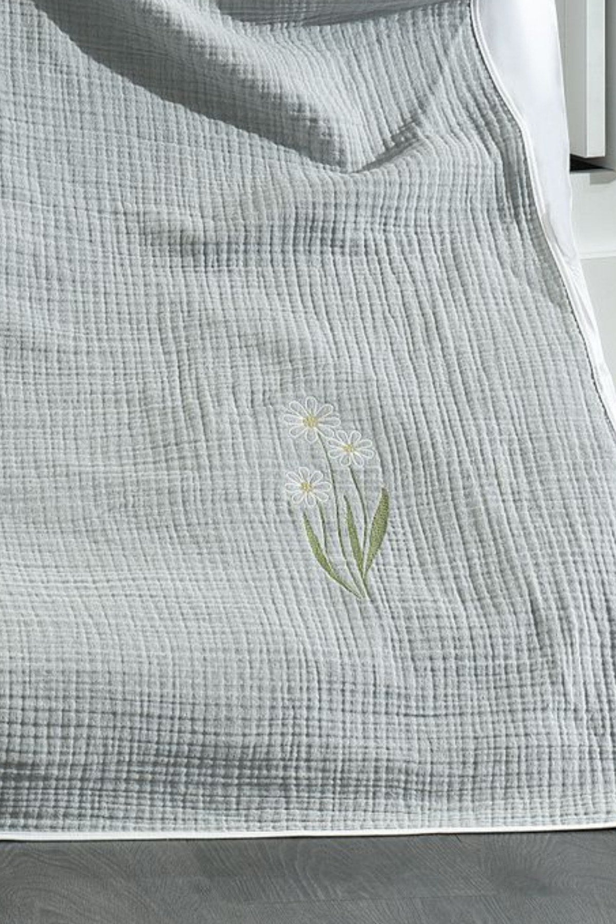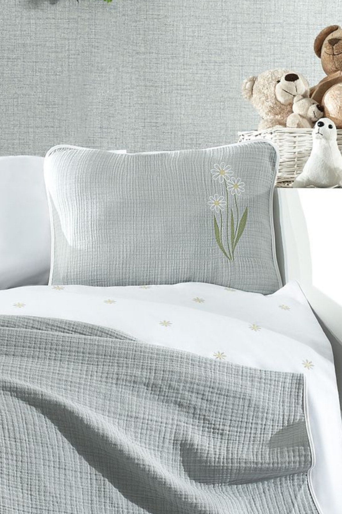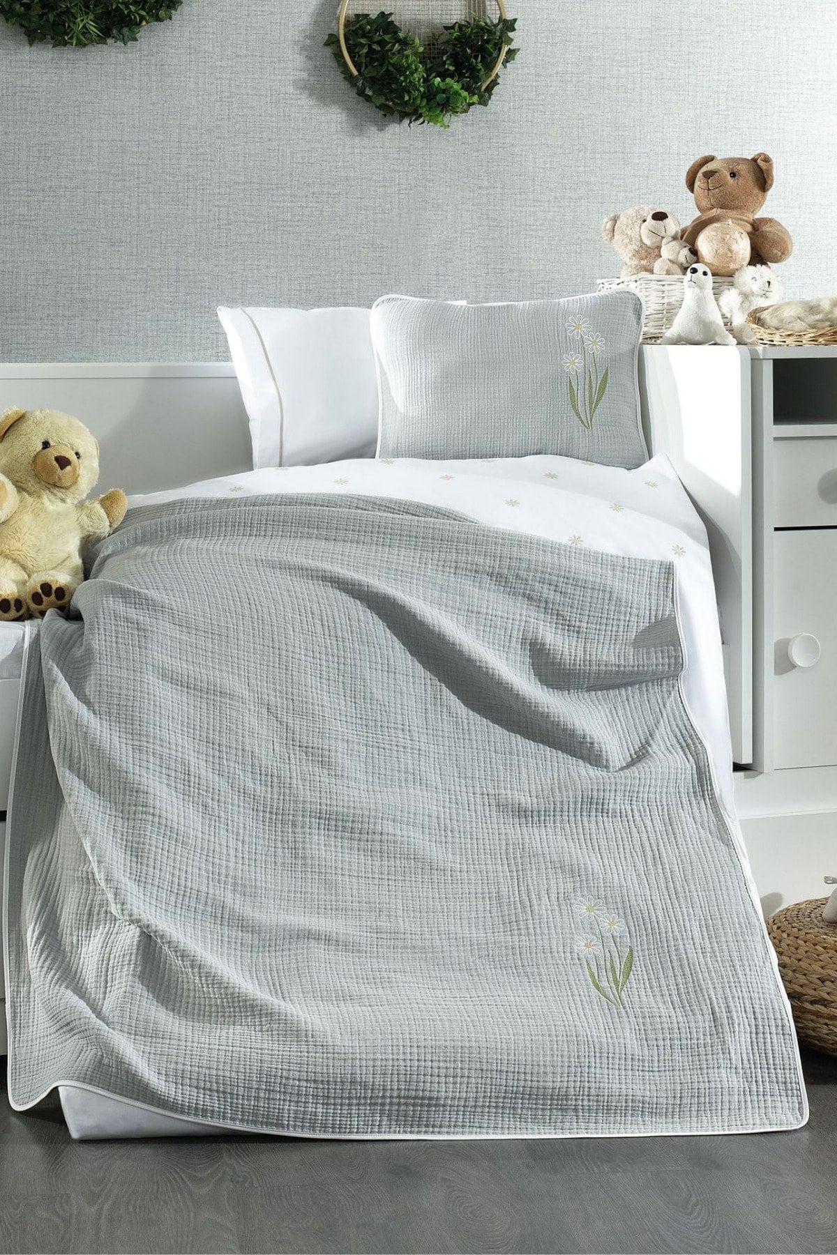 5 Piece Muslin Covered 100% Cotton Daisy Patterned Fairy Tale Gray Baby Duvet Cover Set