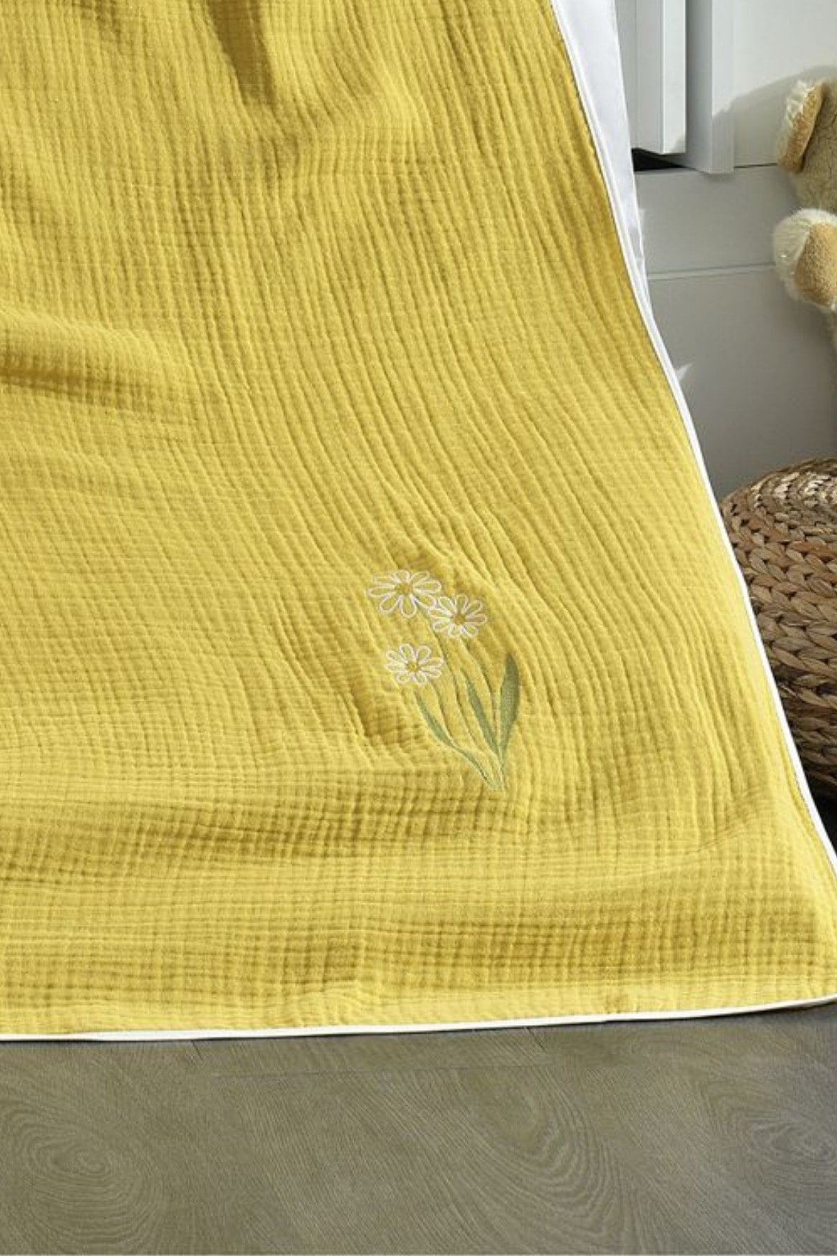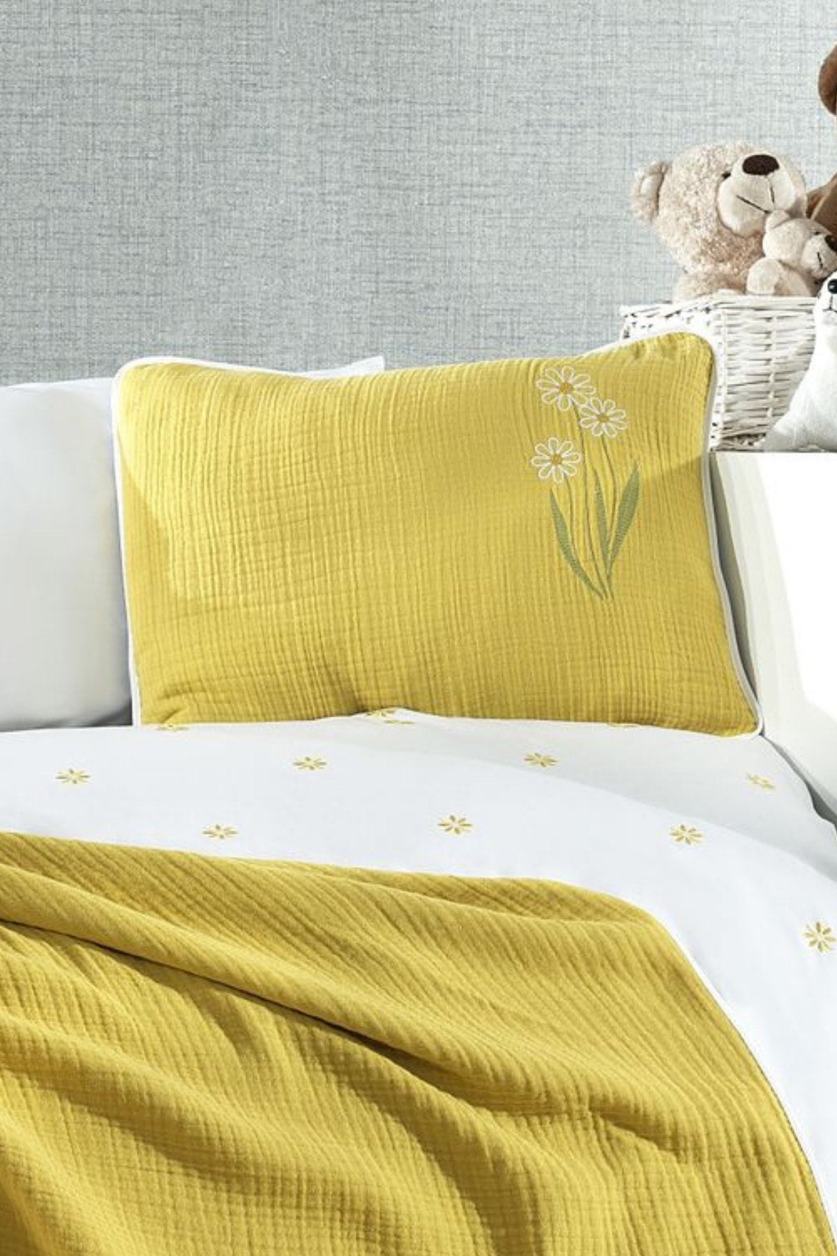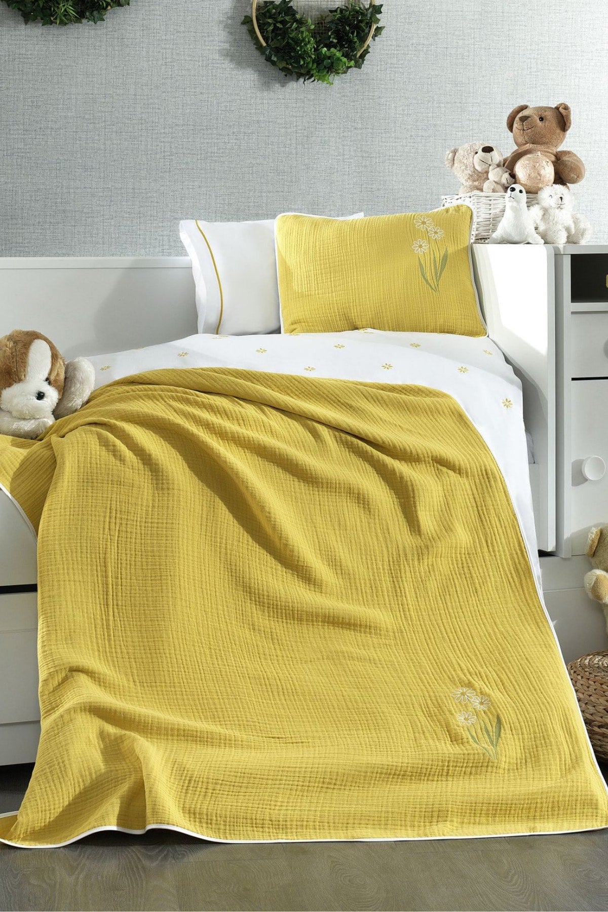5 Piece Muslin Covered 100% Cotton Daisy Patterned Fairy Tale Mustard Baby Duvet Cover Set