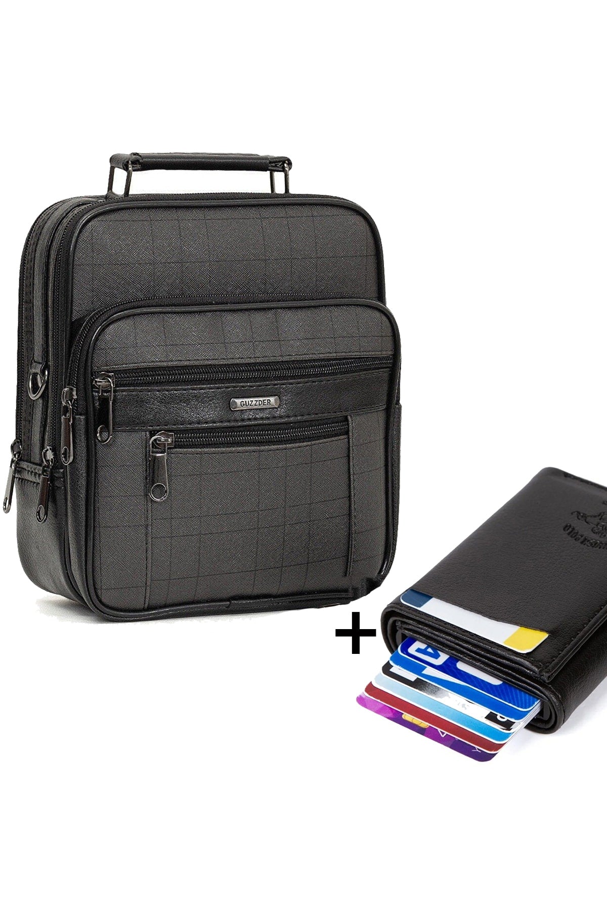Adelina Men'S Black Leather Plaid Steel Case Handbag And Card Holder Wallet With Mechanism