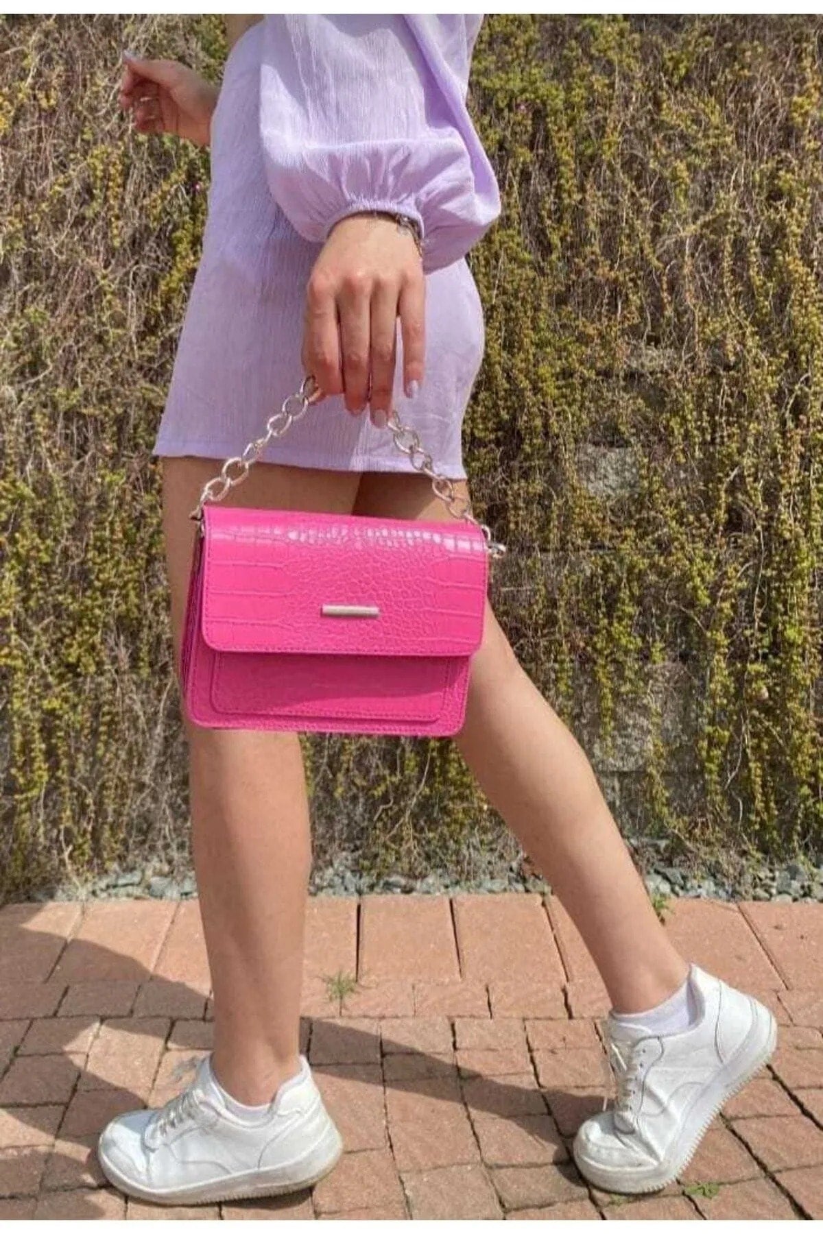 Fuchsia Women Crocodile Patterned Clutch Baguette Chain Strap Bag
