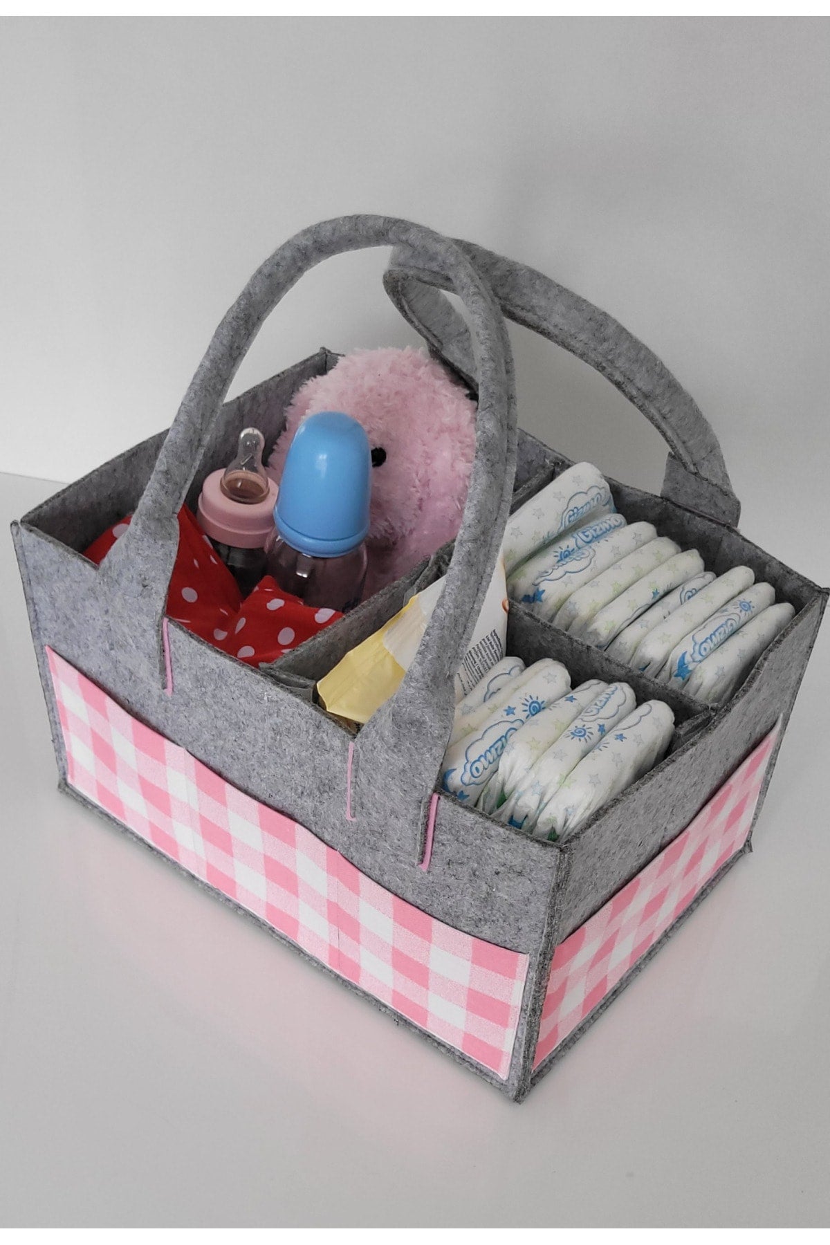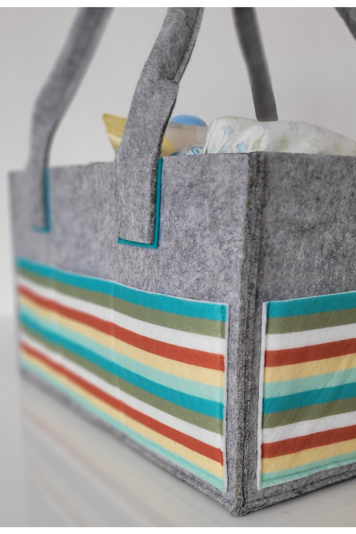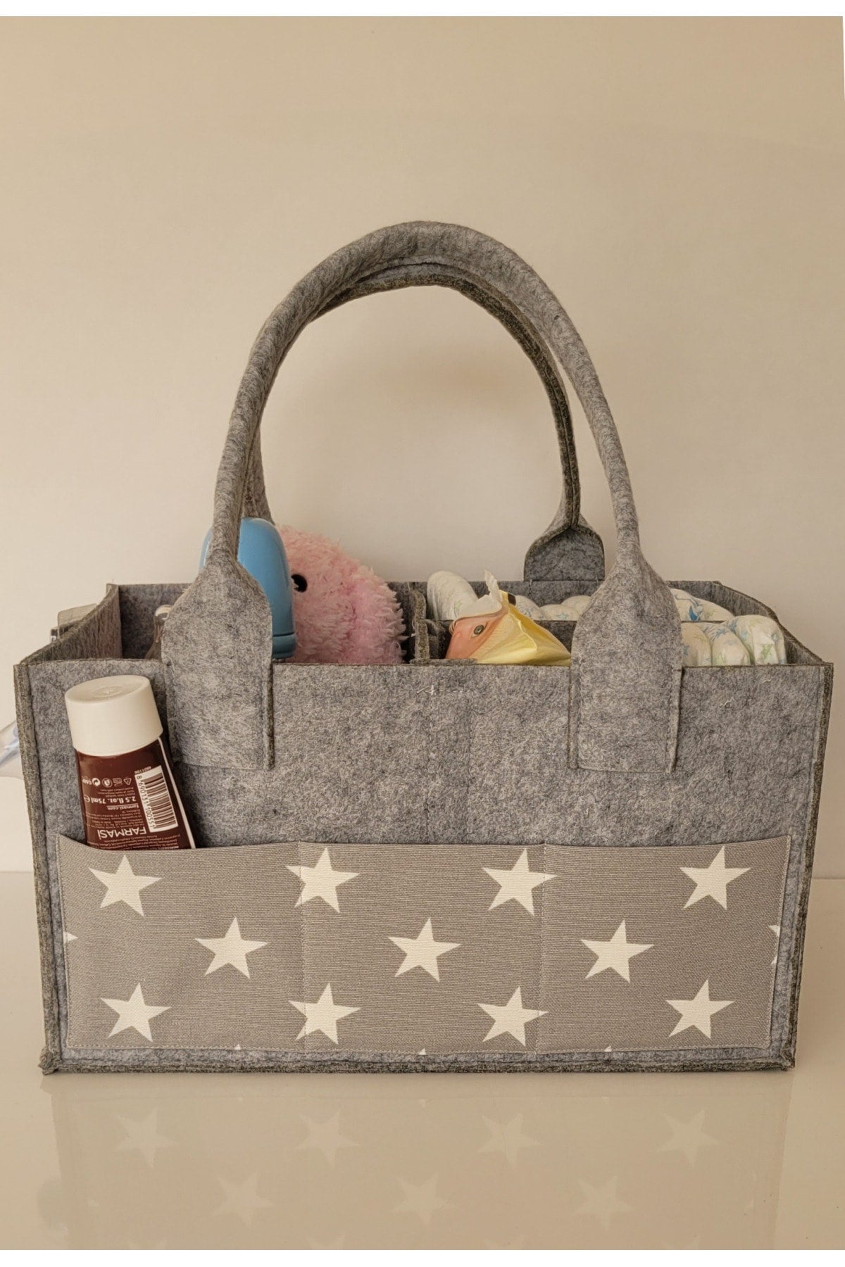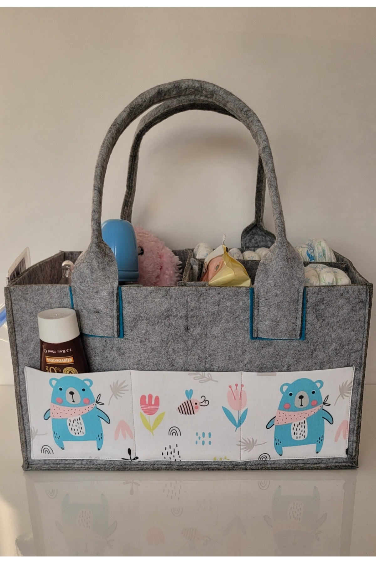 Our products are made of felt and cotton fabric. there are interior compartments that can be used functionally. it is durable thanks to its robust stitching feature that has been tested for durability. it provides functional ease of use, thanks to the removable and plug-in feature of the inner compartments. since it can be used as a single compartment, two or three compartments, it provides convenience in transporting items of different sizes. there are three pockets on the front and two on the sides, so you can keep your baby's care products such as feeding bottles, creams and pacifiers with you. bag dimensions width: 23cm length: 33cm height: 18cm attention washing instructions: please wash by hand and with warm water in order to use our products for a longer life. use soap that does not contain bleach and chemicals. iron at medium temperature without steam. Improved version for clearer understanding and better search visibility. Suitable for users seeking detailed and reliable product information.