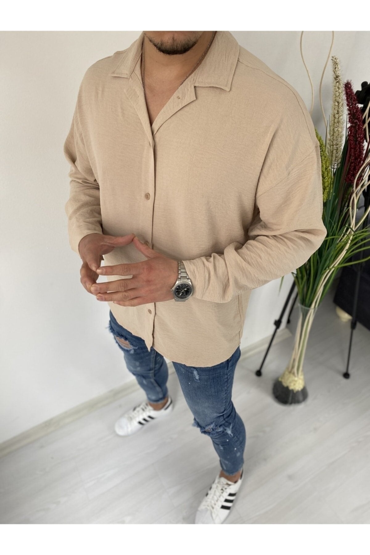 Men'S Beige Linen Aerobin Loose Fit Oversized Loose Shirt