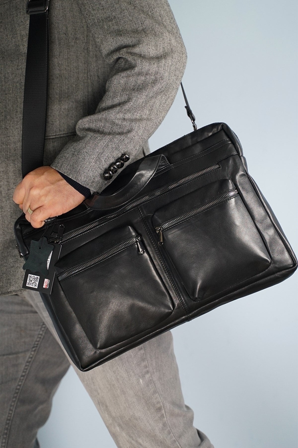 Men'S Black Genuine Leather Large Size Briefcase Laptop Hand And Shoulder Bag