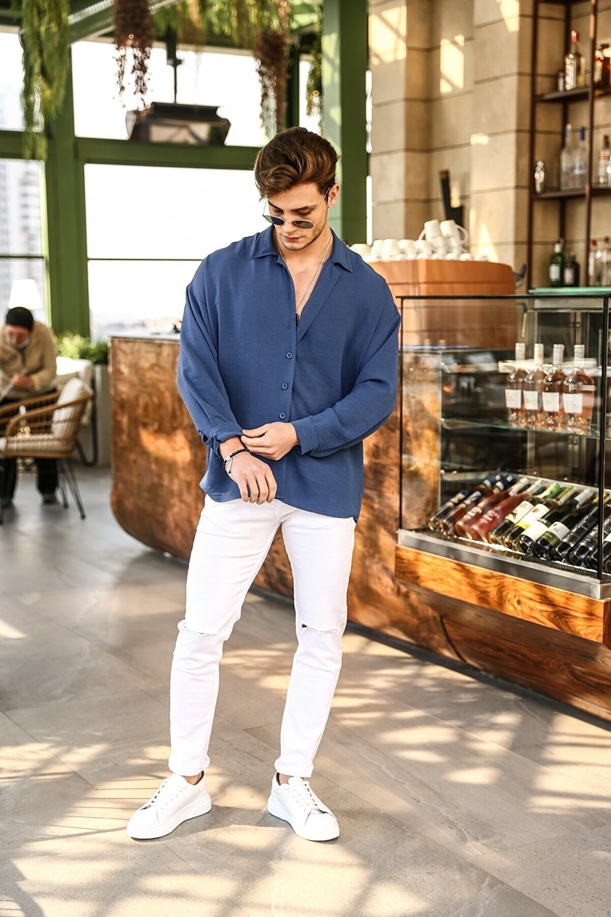 Men'S Navy Blue Linen Aerobin Loose Fit Oversize Loose Shirt