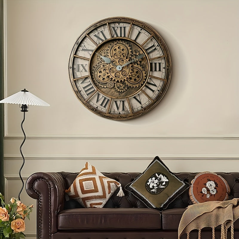 TIMESS Gear Decorative Wall Clock, 18-inch Oversized Size, Roman Numerals, Industrial Mechanical Atmosphere, American Country Style, Battery-powered Silent Timekeeping, No Ticking, Perfect Home Decoration And Holiday Gift