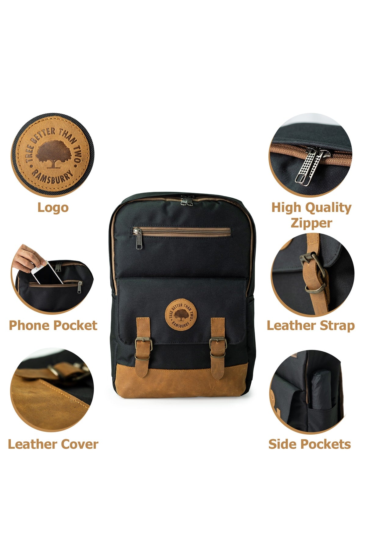 Unisex Black 100% Genuine Leather Detailed Waterproof 15.6 Inch Multi-Compartment Backpack With Laptop Compartment
