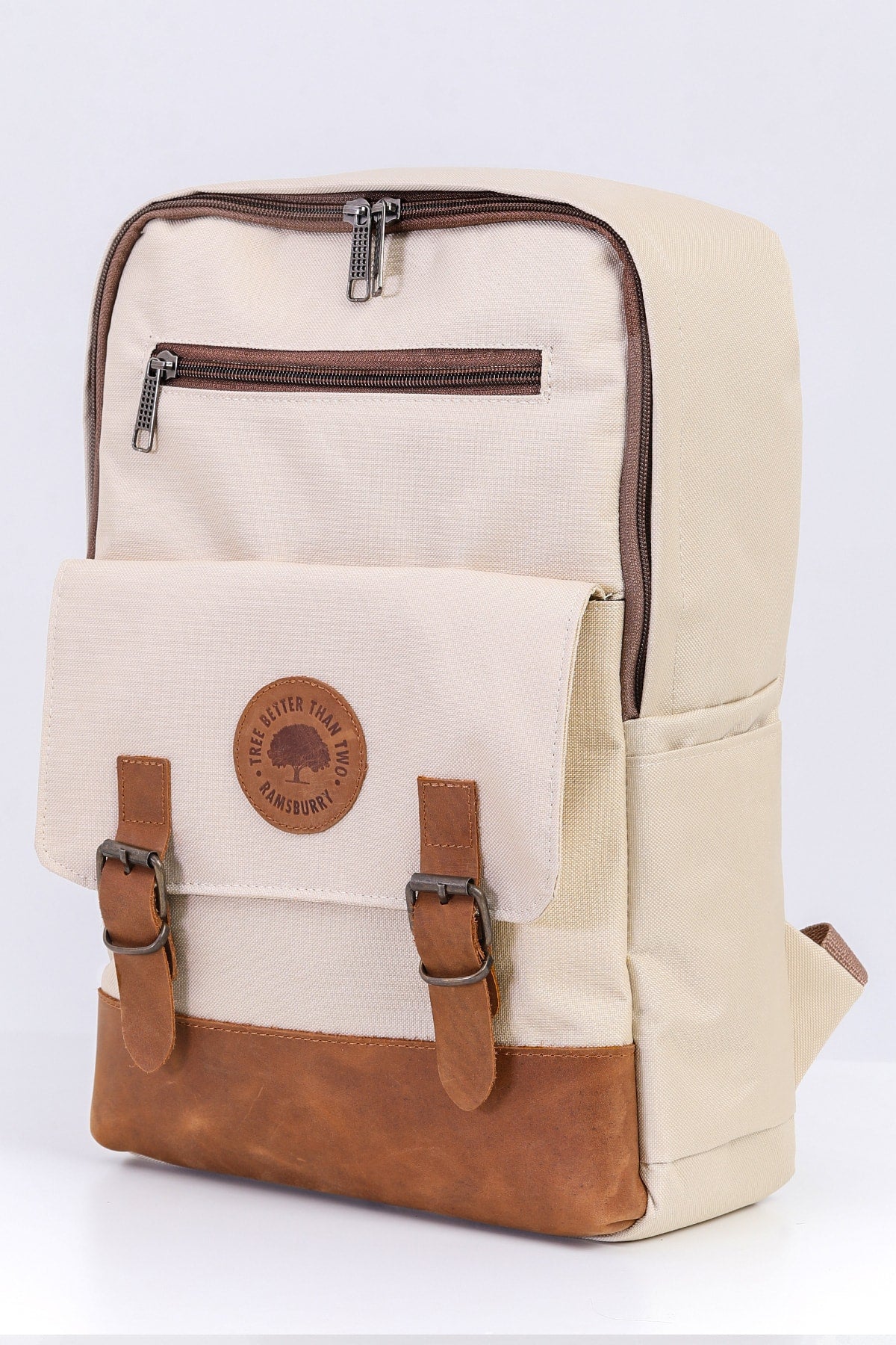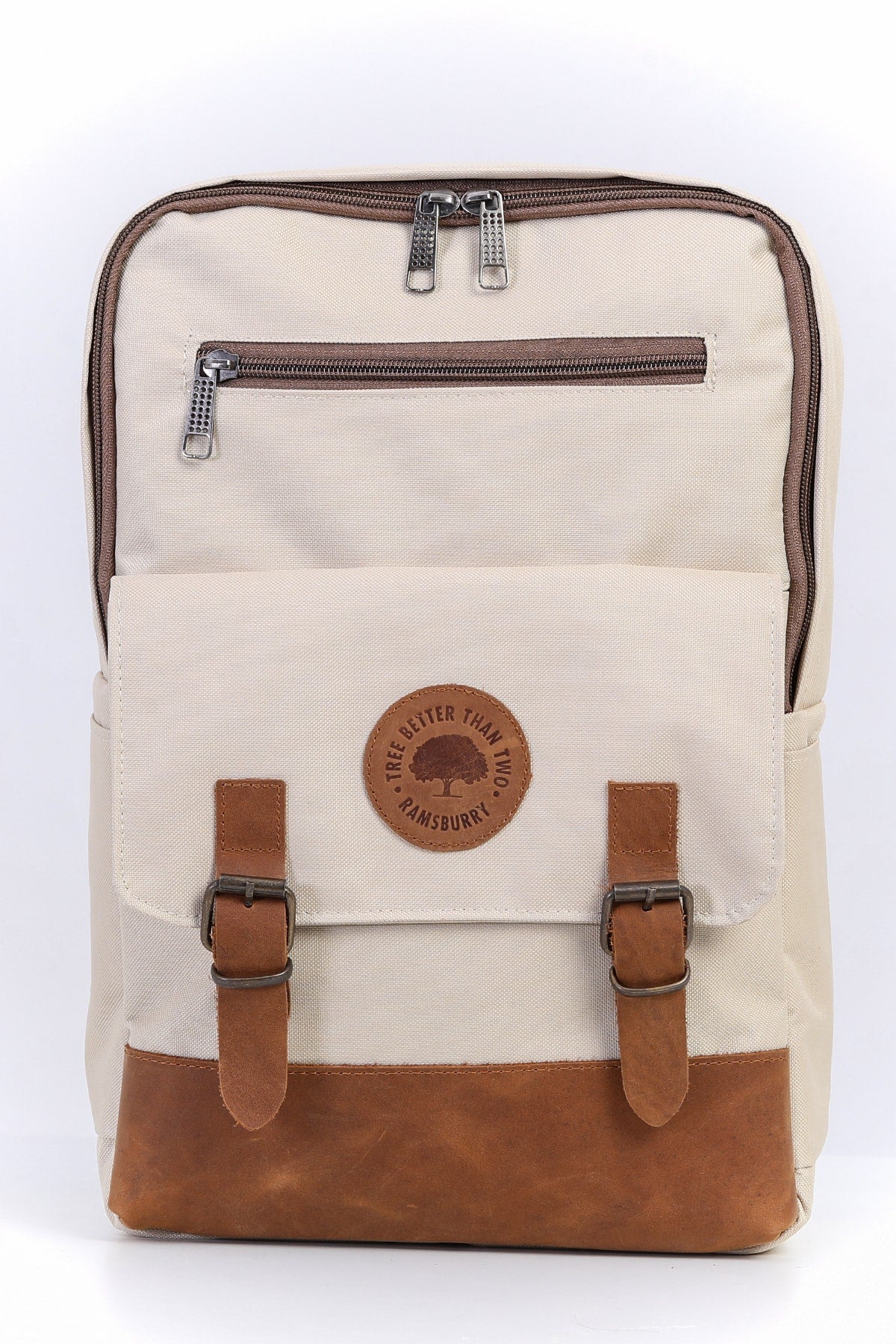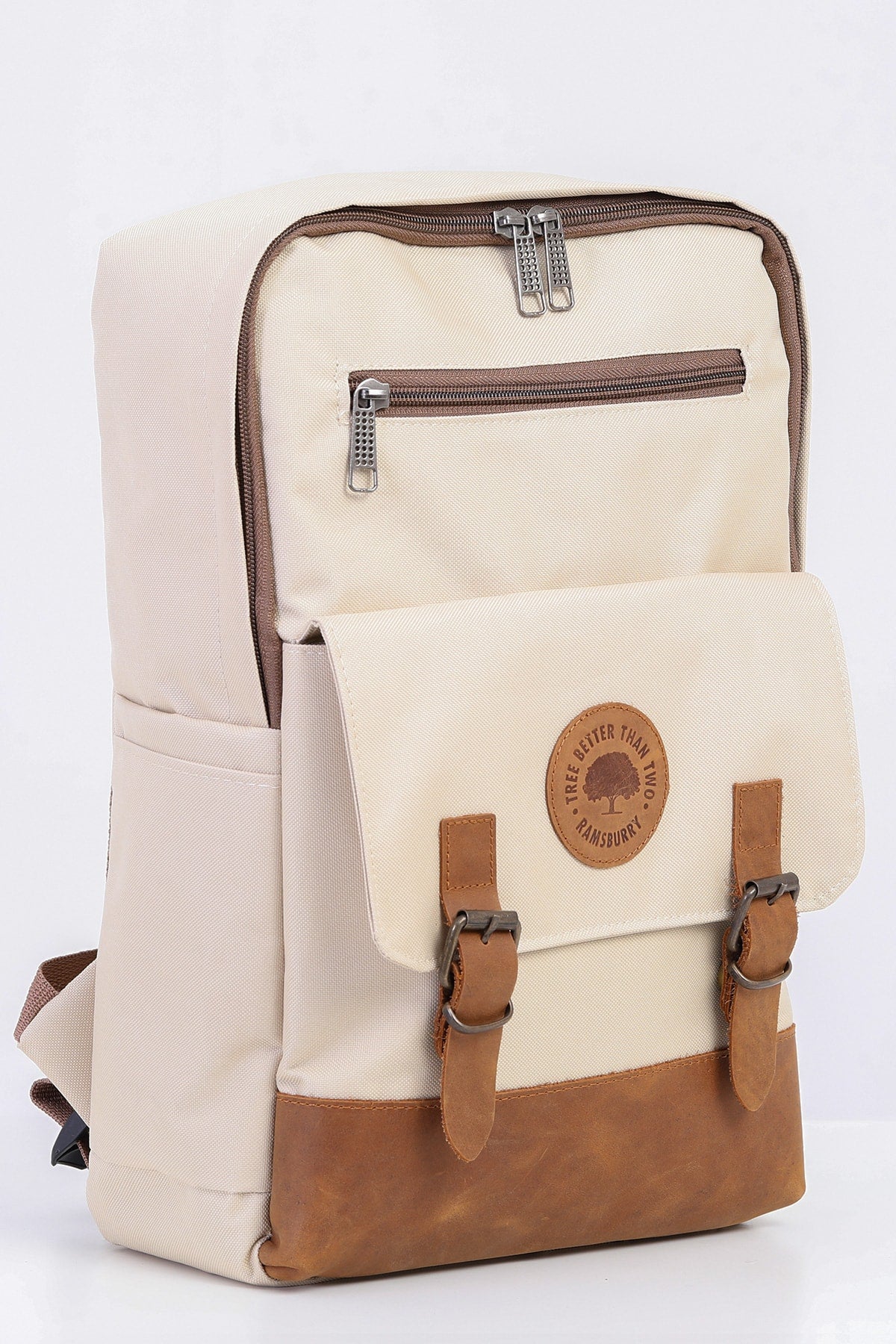 Unisex Cream 100% Genuine Leather Detailed Waterproof 15.6 Inch Multi-Compartment Backpack With Laptop Compartment