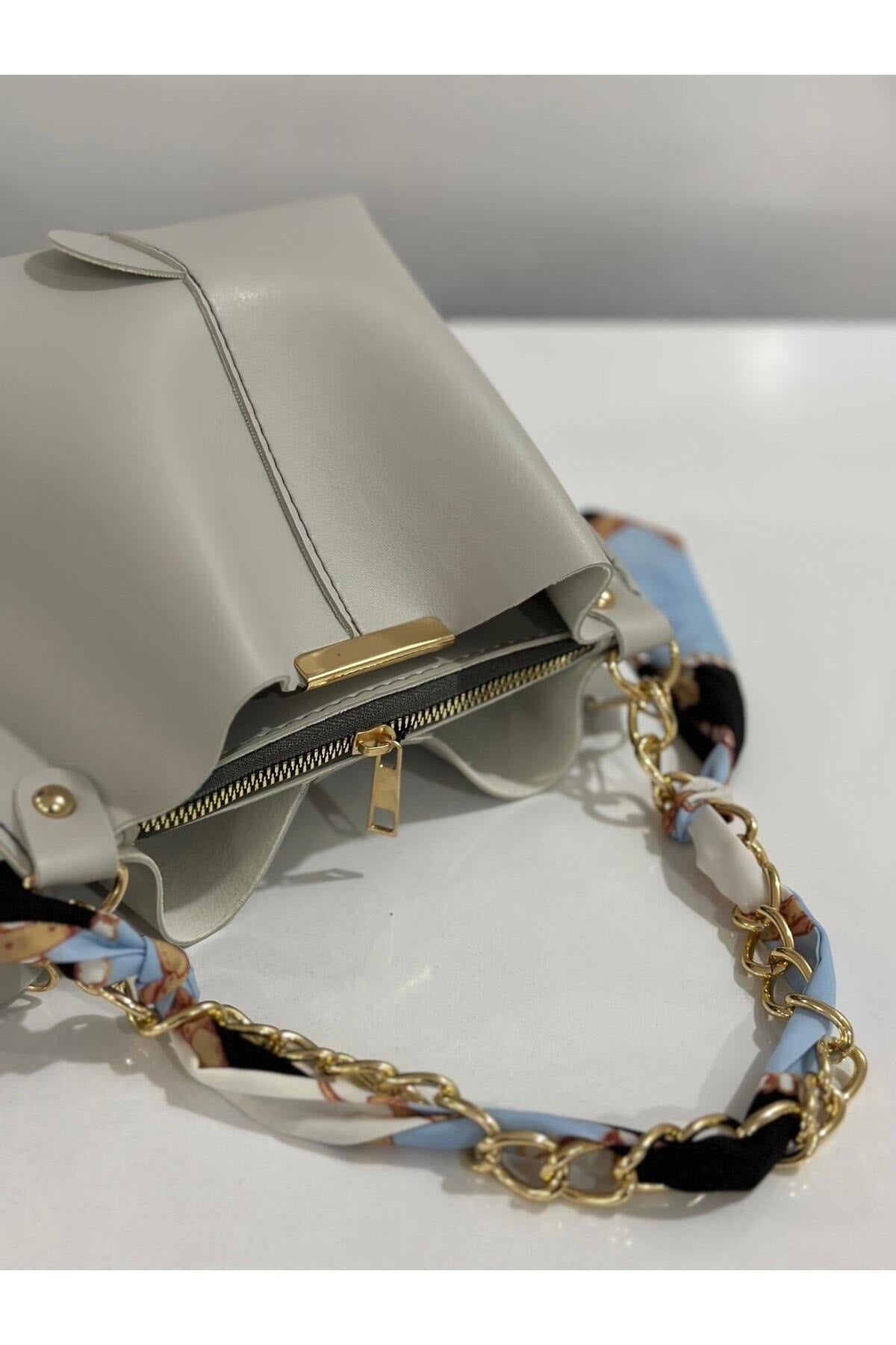 Women'S Scarf Light Gray Chain Accessory Soft Leather 3-Compartment Hand, Arm And Shoulder Bag