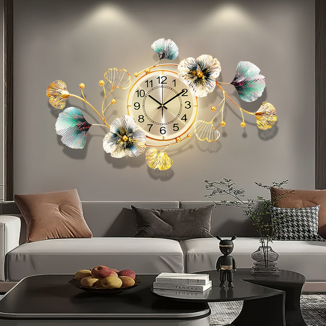 Golden Modern 3D Ginkgo Leaf Decoration Wall Clocks, 37x20 Inche Large Wall Clocks, Silent Creative Decorative Clock, Creative Metal Flower Wall Clock, for Living Room Bedroom Kitchen