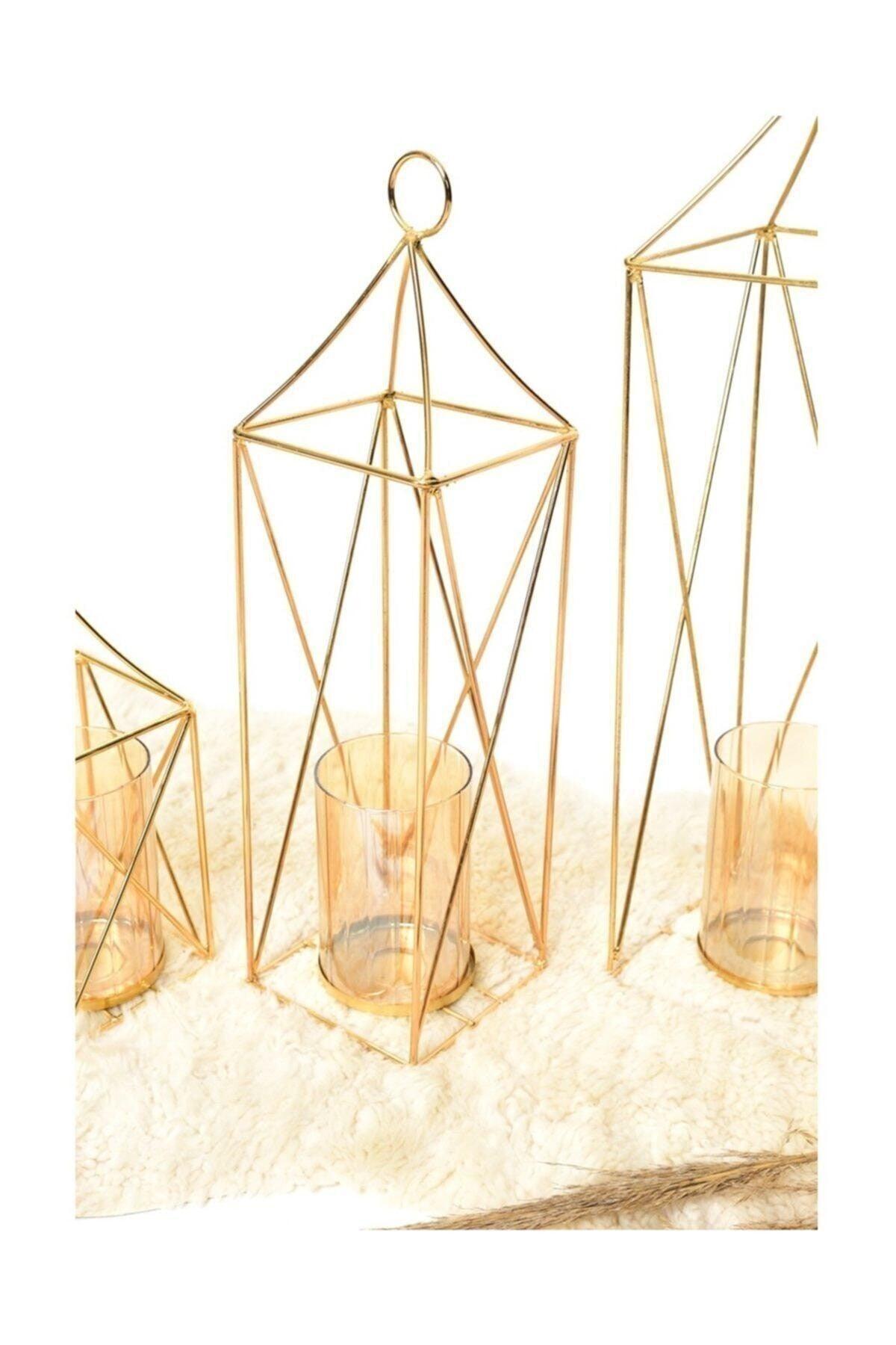 Metal Geometric 3 Pcs ( Triple ) Gold Candlestick Candle Holder Decorative Candle Holder 23Cm Stainless Plated Home Decoration