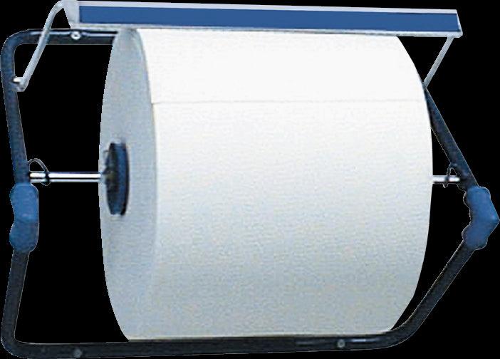 לגלילים תעשייתיים, מחזיק רולר עשוי מתכת לכה כחולה L עם מסילת קריעה להרכבה על הקיר, לגלילים עד ברוחב 400 מ"מ ו-400 מ"מ Ø (משלוח ללא גליל בד ניקוי)