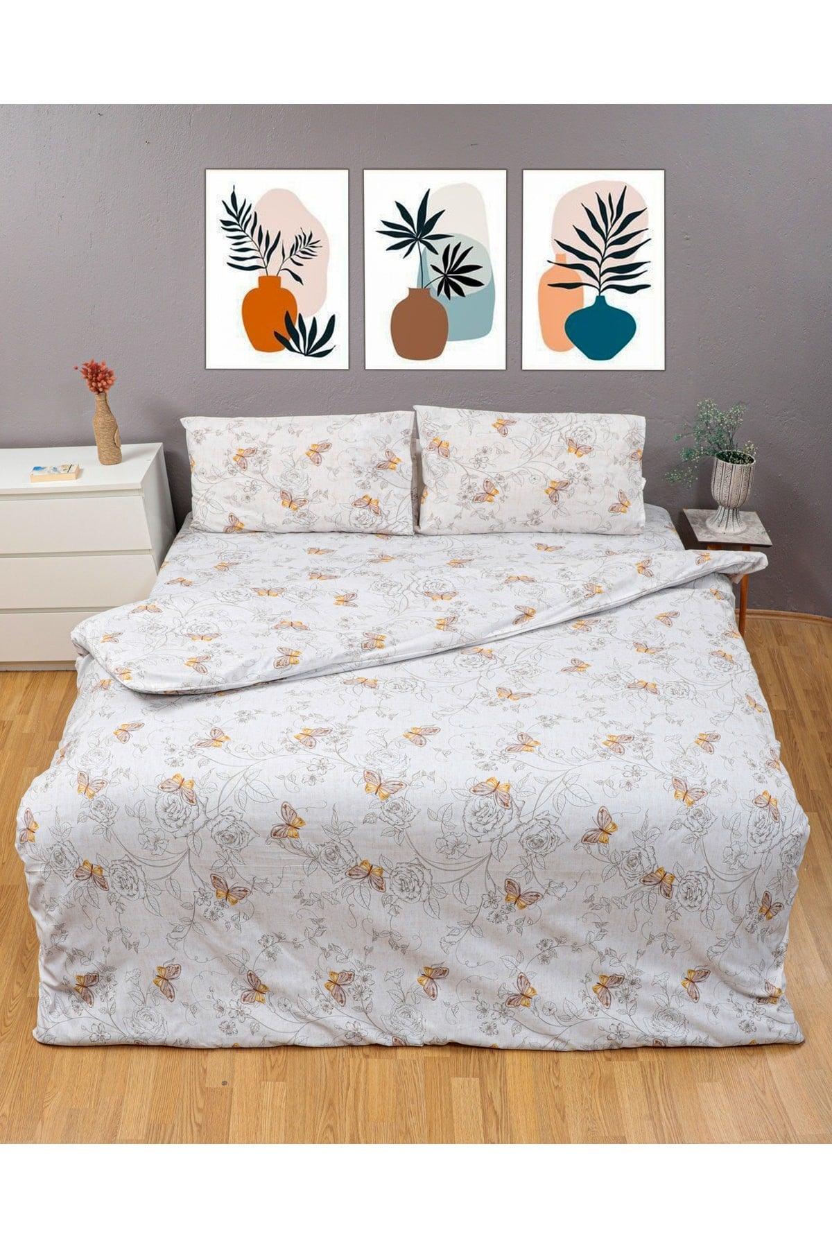 סט כיסוי פוך בדוגמת פרפר, בד Ranforce כותנה כפול - פרפר ורד קרם