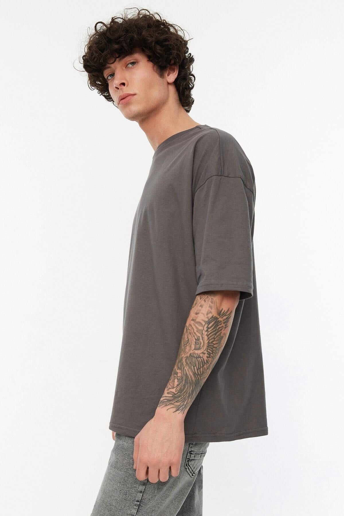 Anthracite Men'S Basic 100% Cotton Crew Neck Oversized Short Sleeved T-Shirt