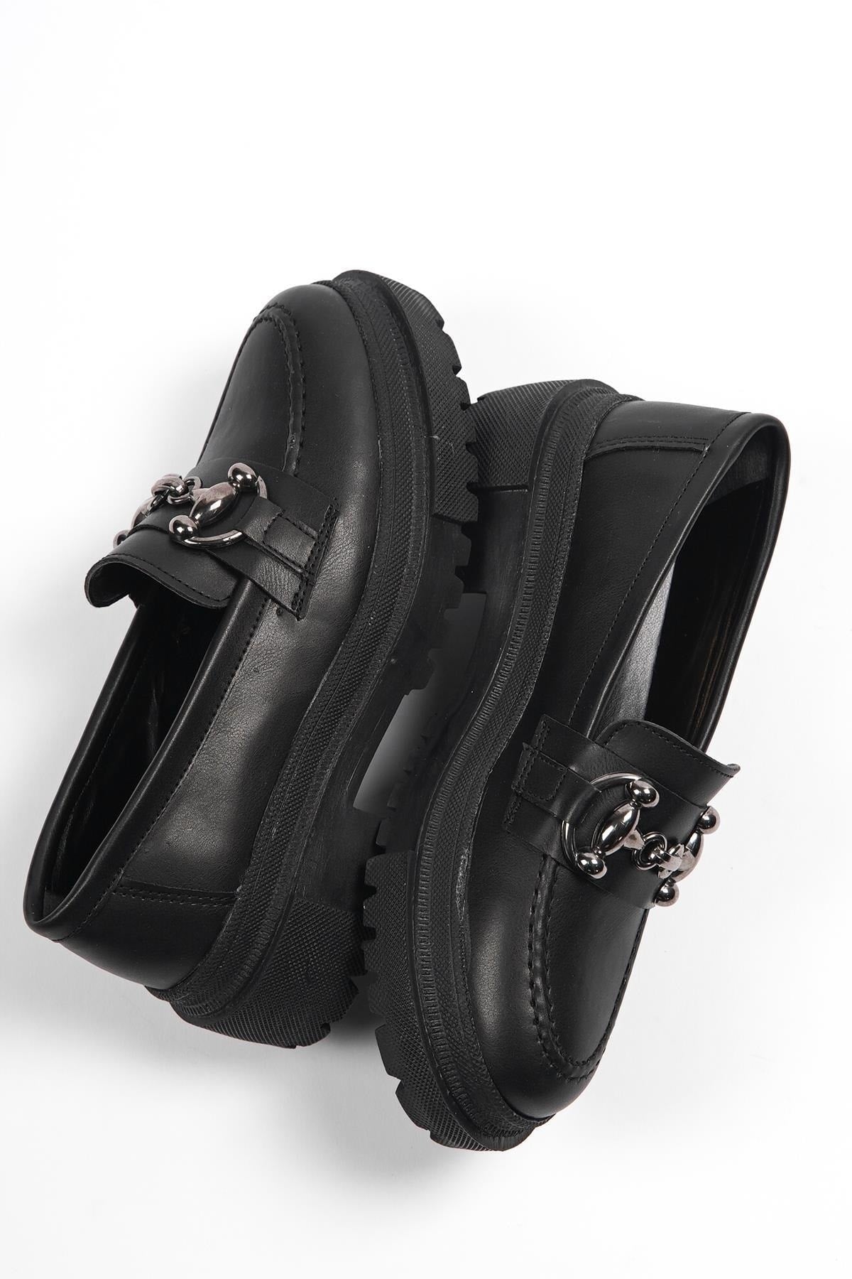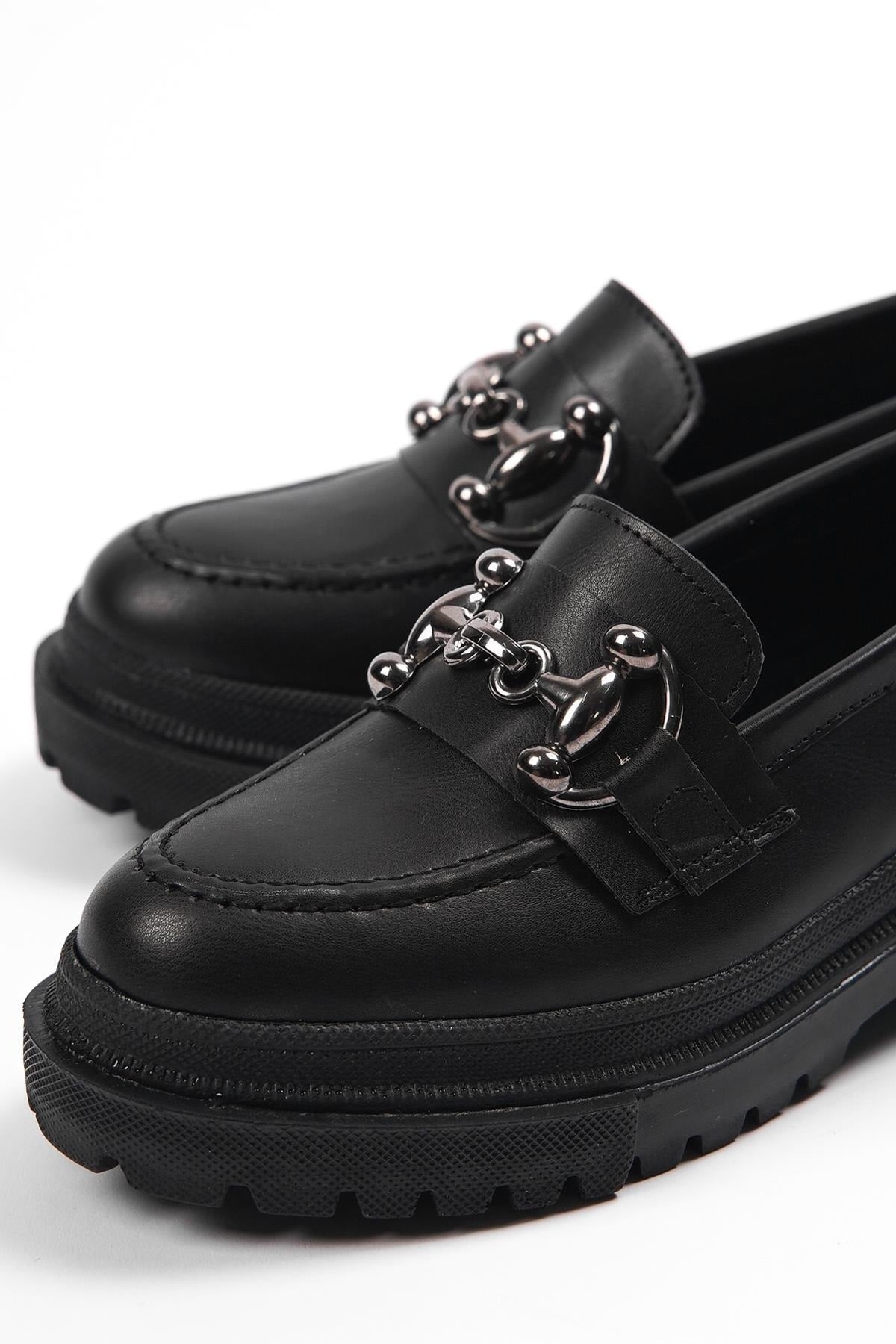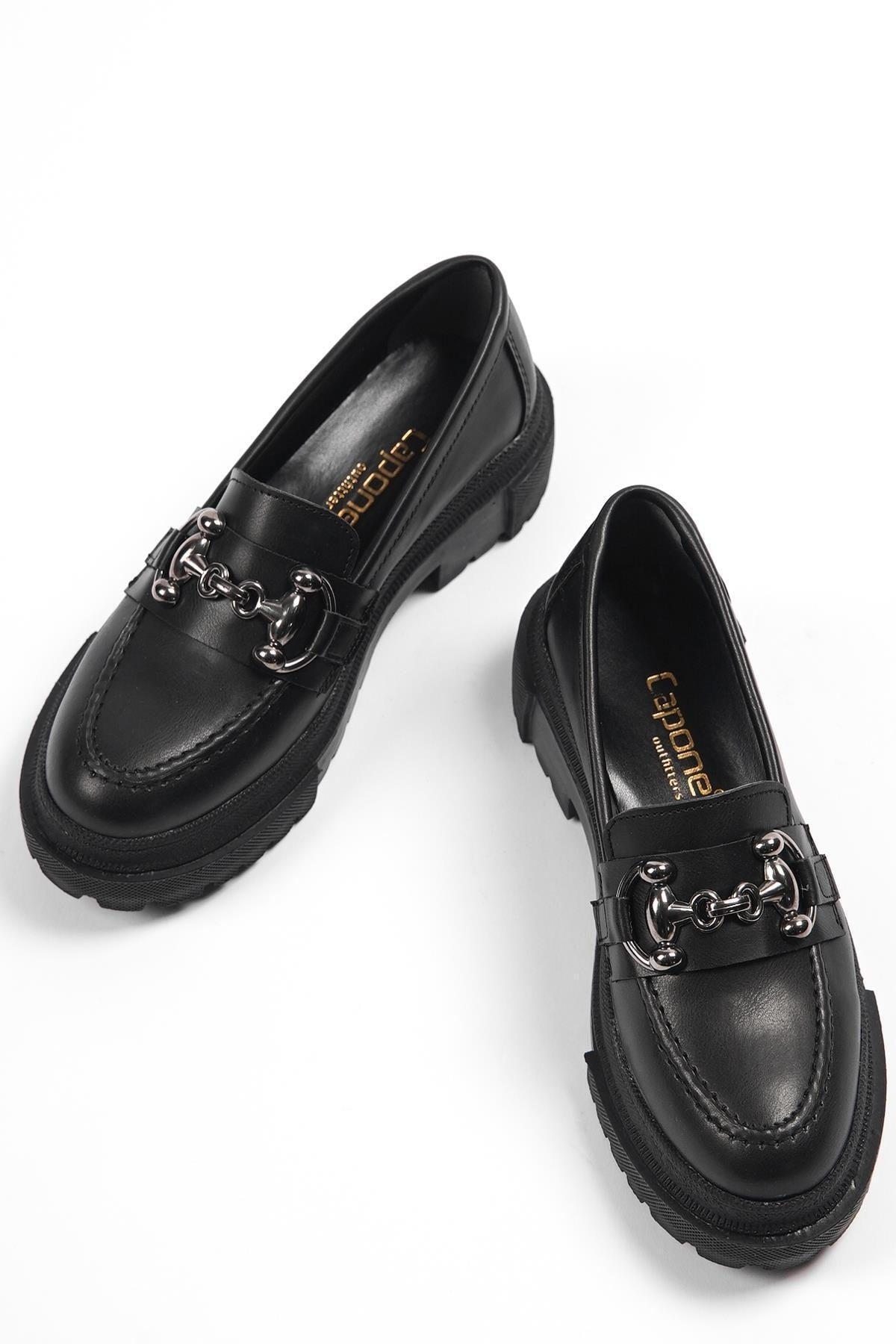 Capone Oval Toe Metal Buckle Trak Sole Black Women'S Loafers