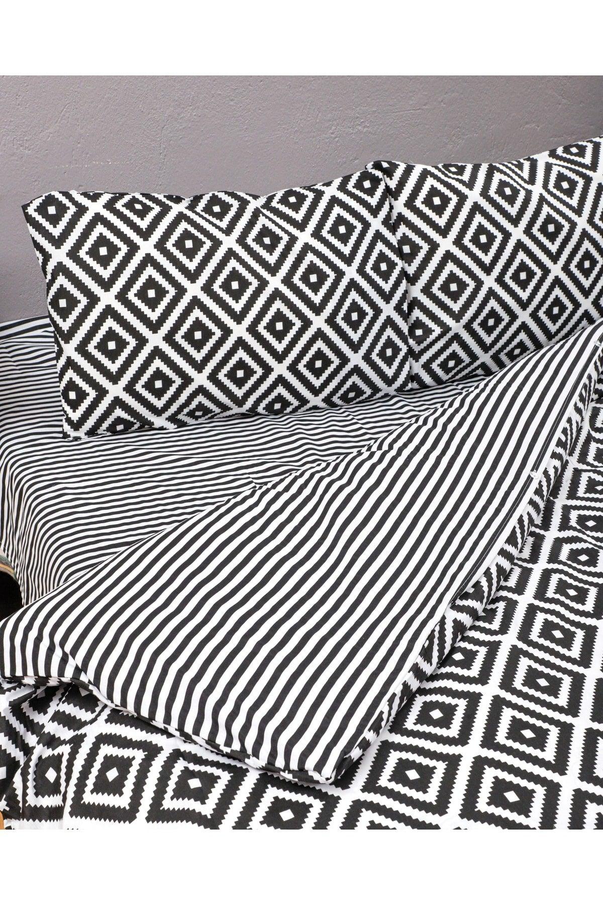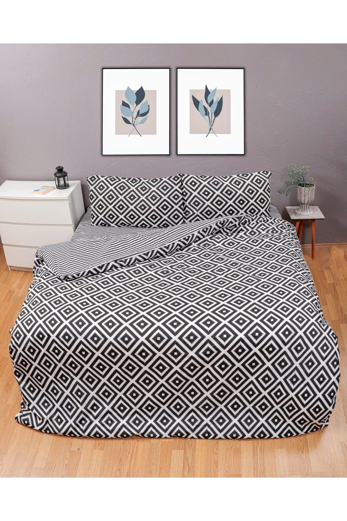 Black Striped Checkered Duvet Cover Set Cotton Ranforce Fabric, Reversible - Black - Swordslife