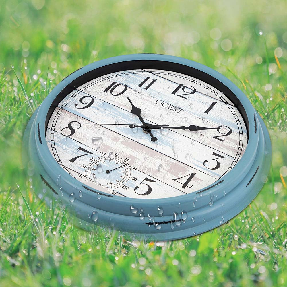 16 Inch Large Outdoor Clock Retro Clock Non-Ticking Clock with Thermometer Battery Operated Wall Clock for Patio, Garden, Pool
