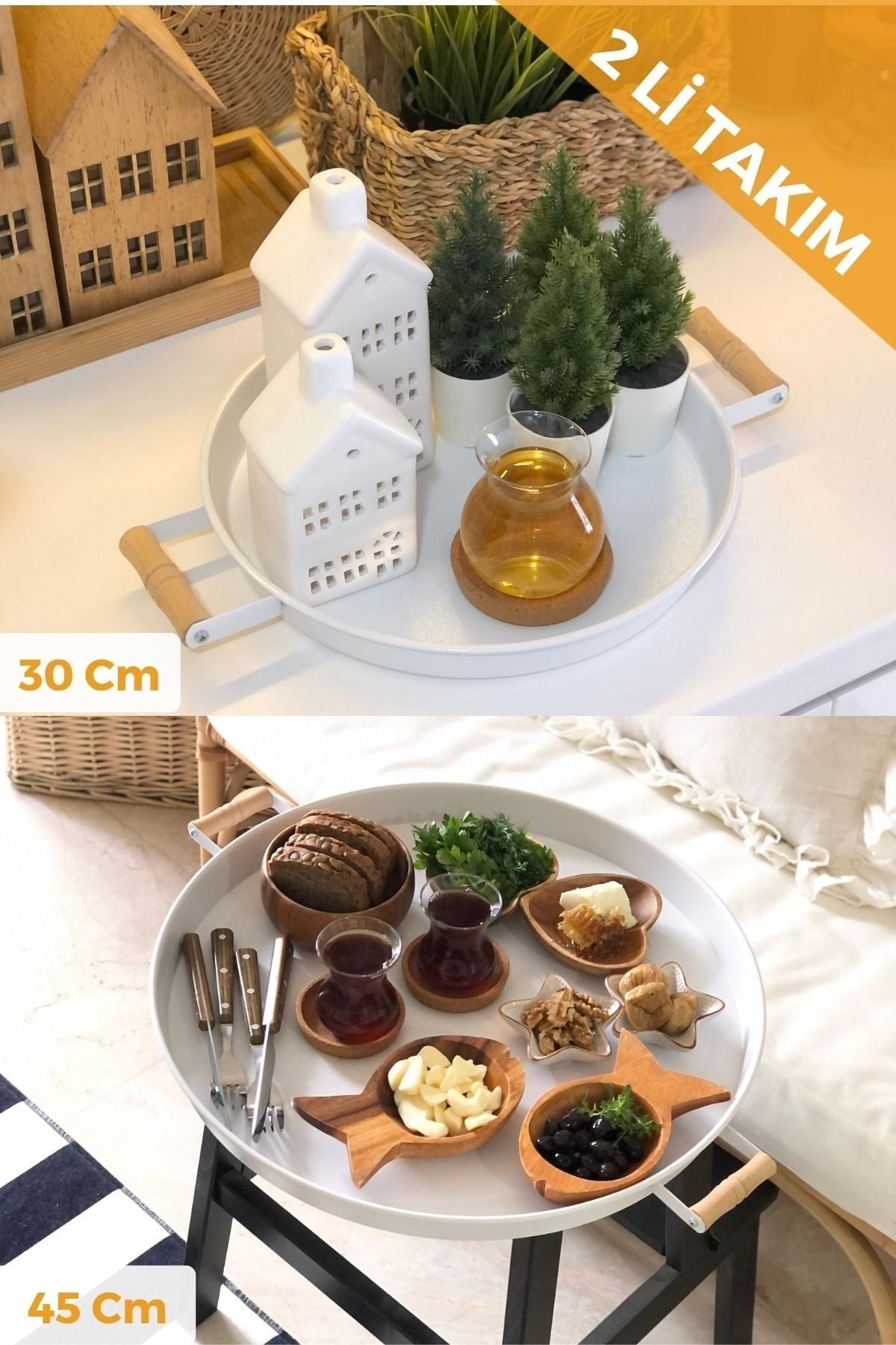 2 Wooden Handled 45 Cm Metal Tray And 30 Cm White Tray Tea Coffee Serving Tray