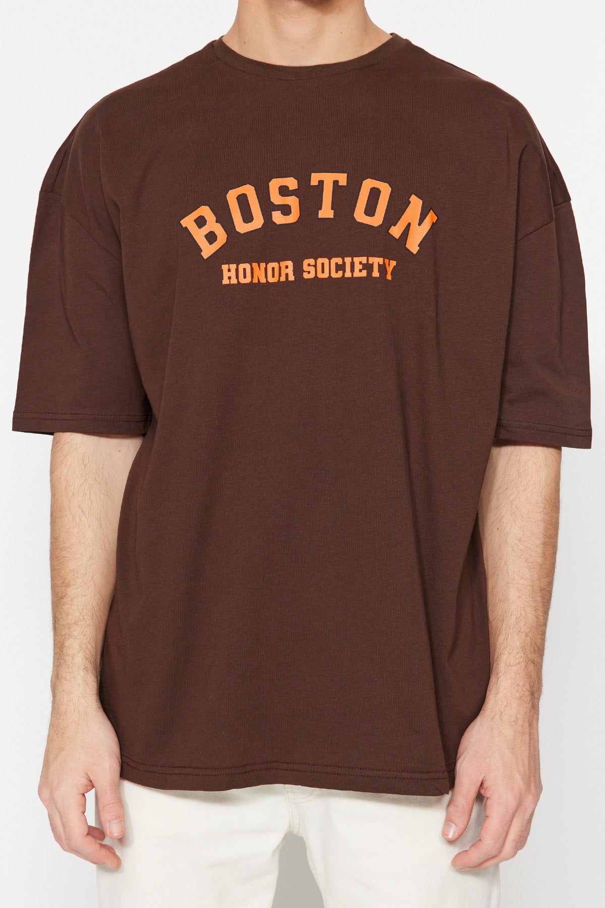 Brown Men'S Oversize Crew Neck Short Sleeve City Printed 100% Cotton T-Shirt Tmnss21Ts1217