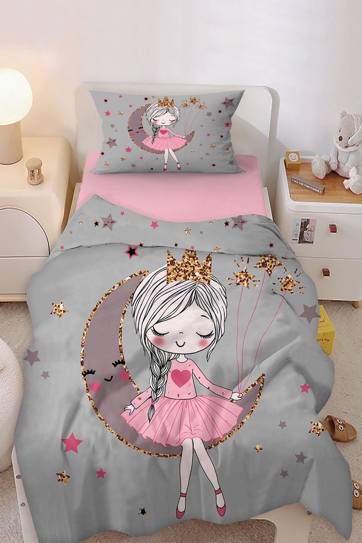 Cute Princess Girl Sitting On The Moon Patterned Single Baby Kids Duvet Cover Set