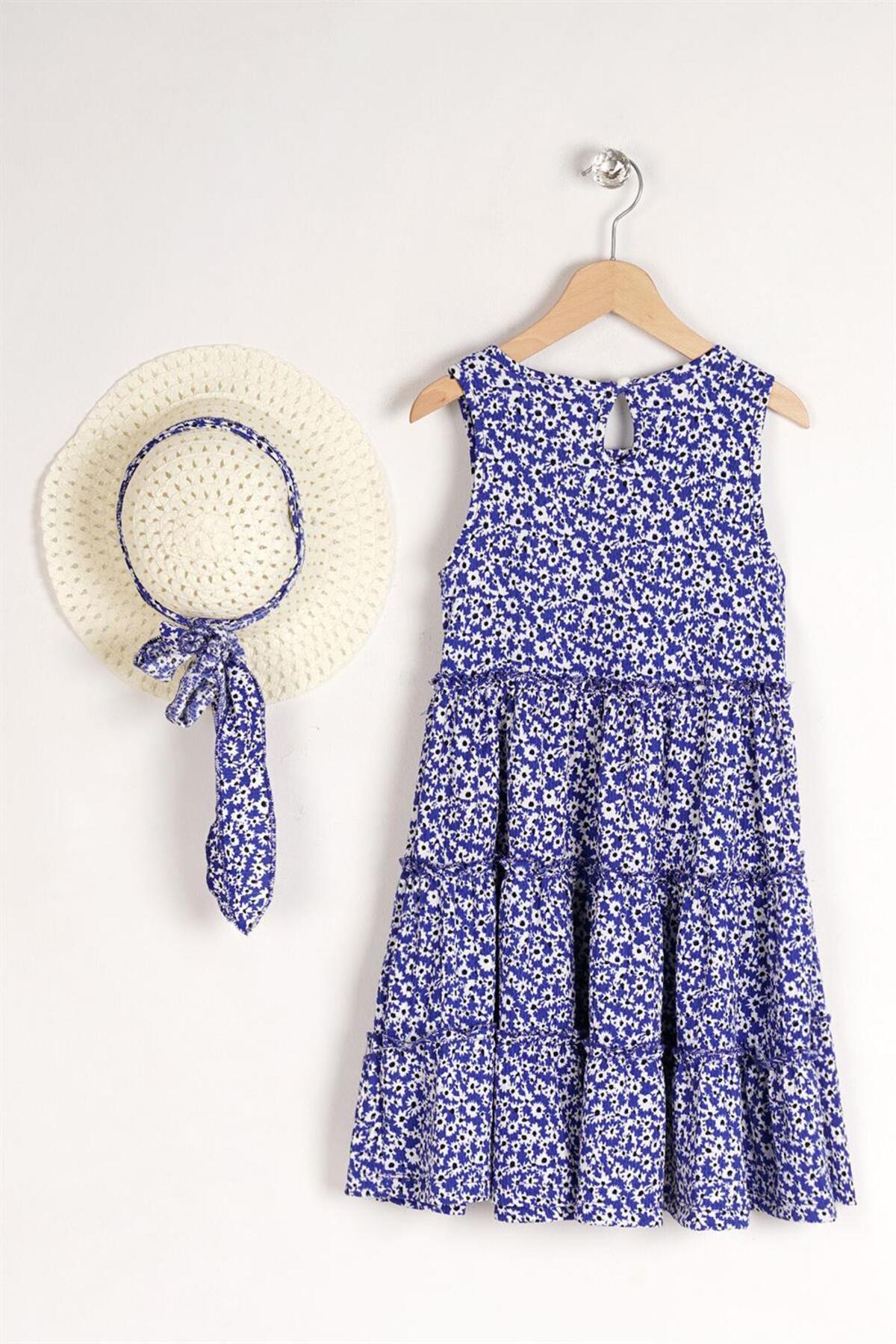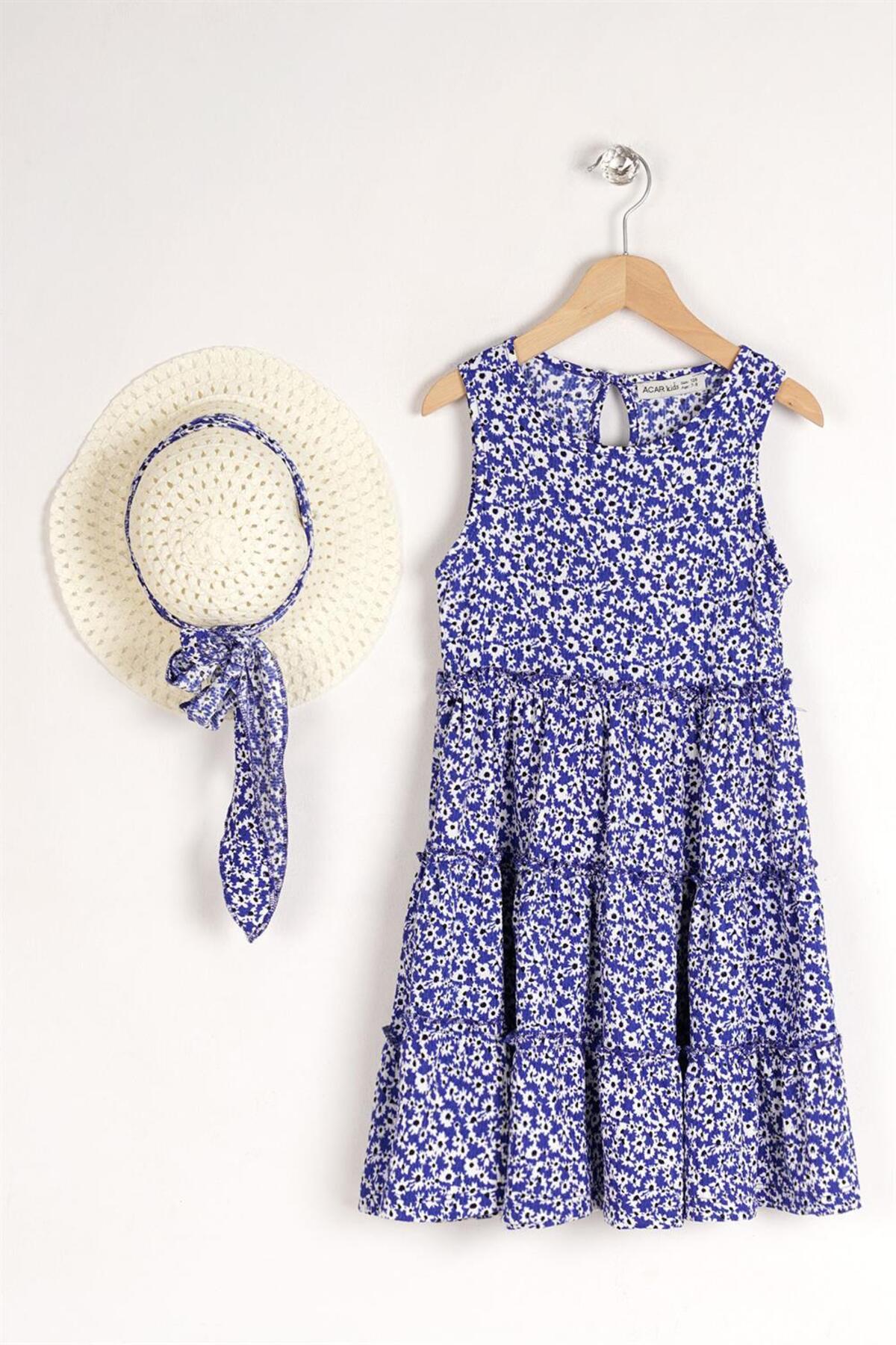 Girl'S Sax Colored Floral Patterned Dress With Hat Accessory