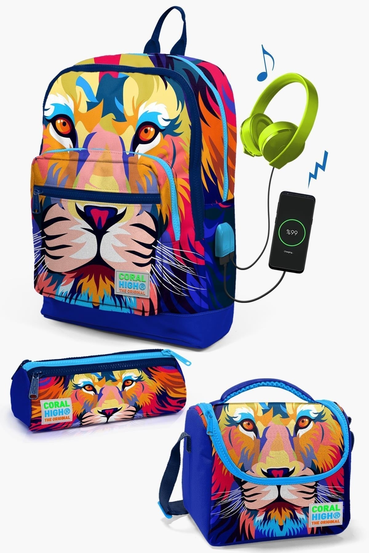 Kids Navy Blue Sax Patterned Usb 3-Piece School Bag Set Set0123841