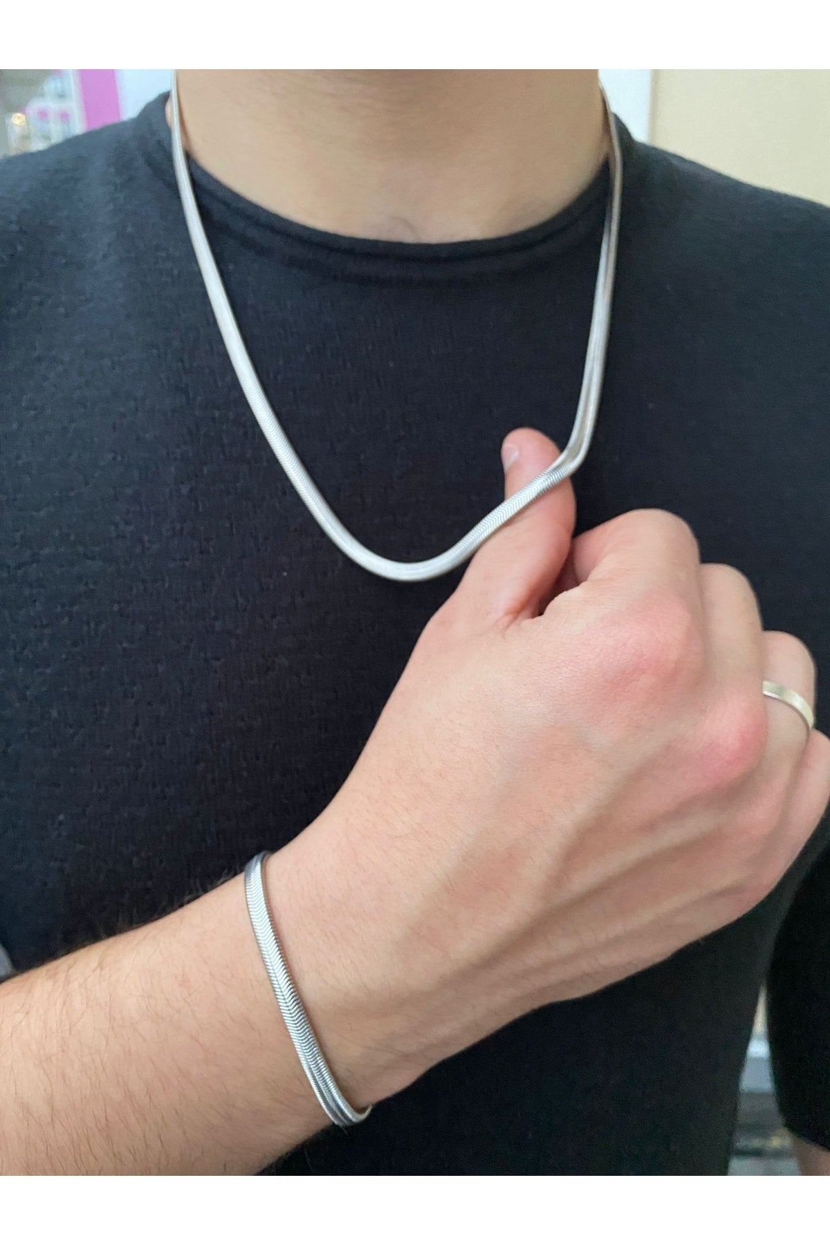 Men'S Straw Model Necklace Bracelet Set Silver Gray Color Steel