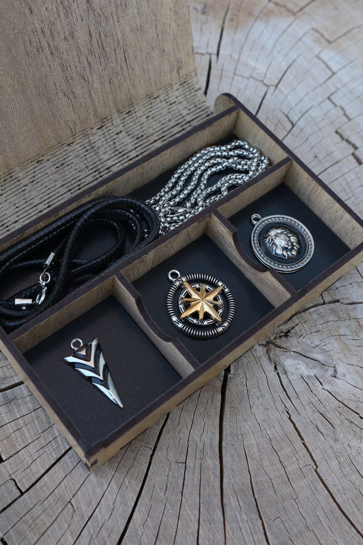 Necklace Set Wooden Special Gift Boxed Triagle Arrow, Pole Compass And Lion Imprint Rope And Chain