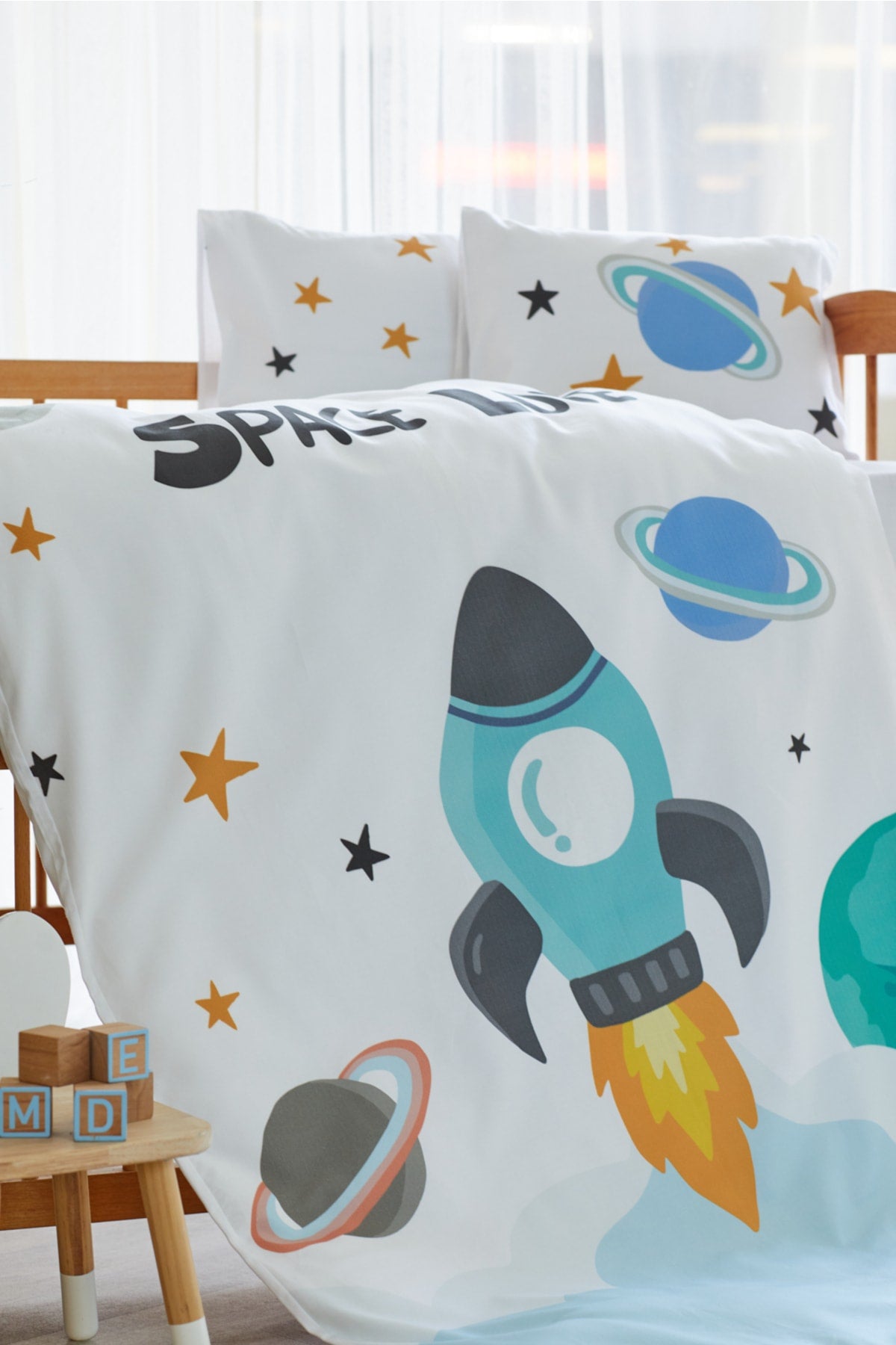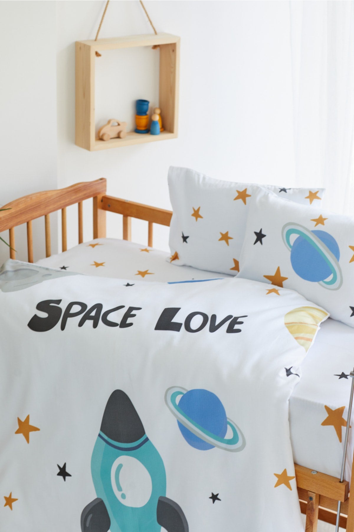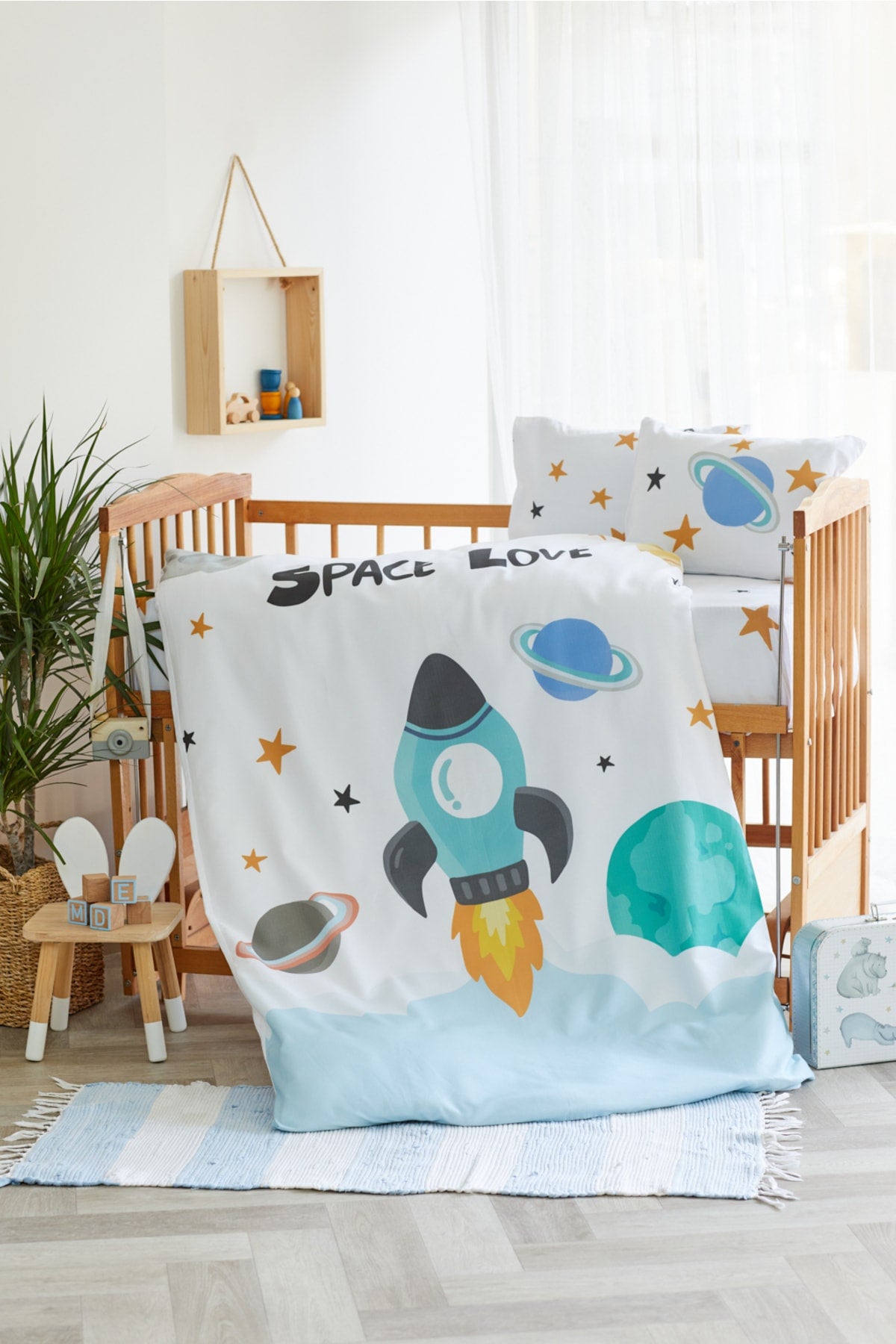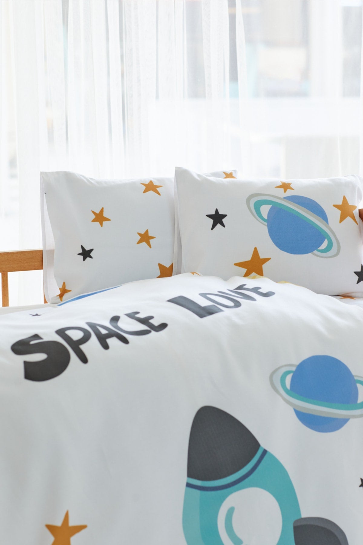 Organic Full Set Printed Cotton Satin Baby Duvet Cover Set - Rocket And Space Theme