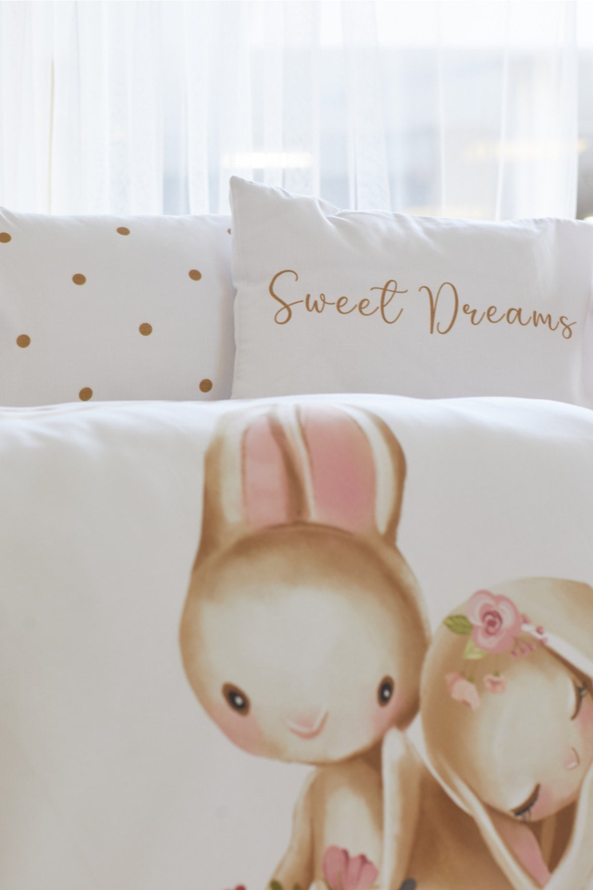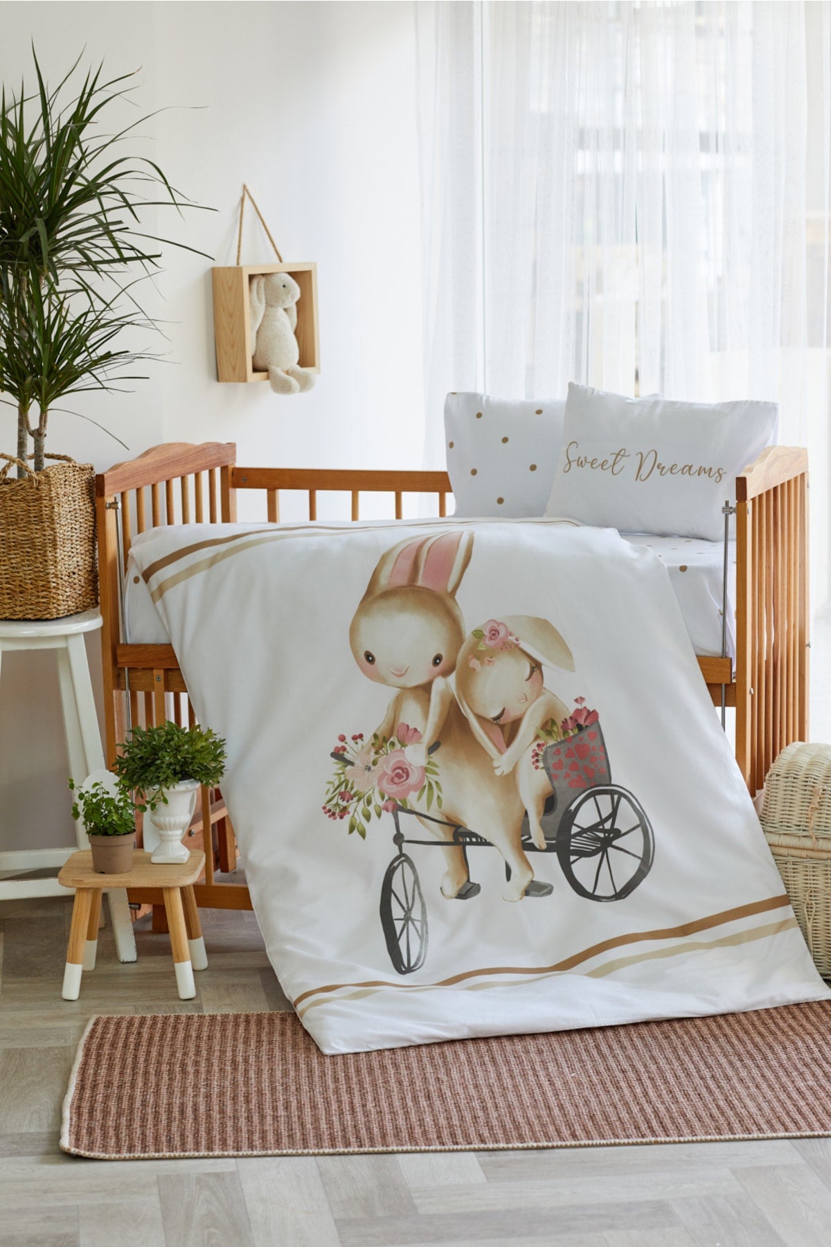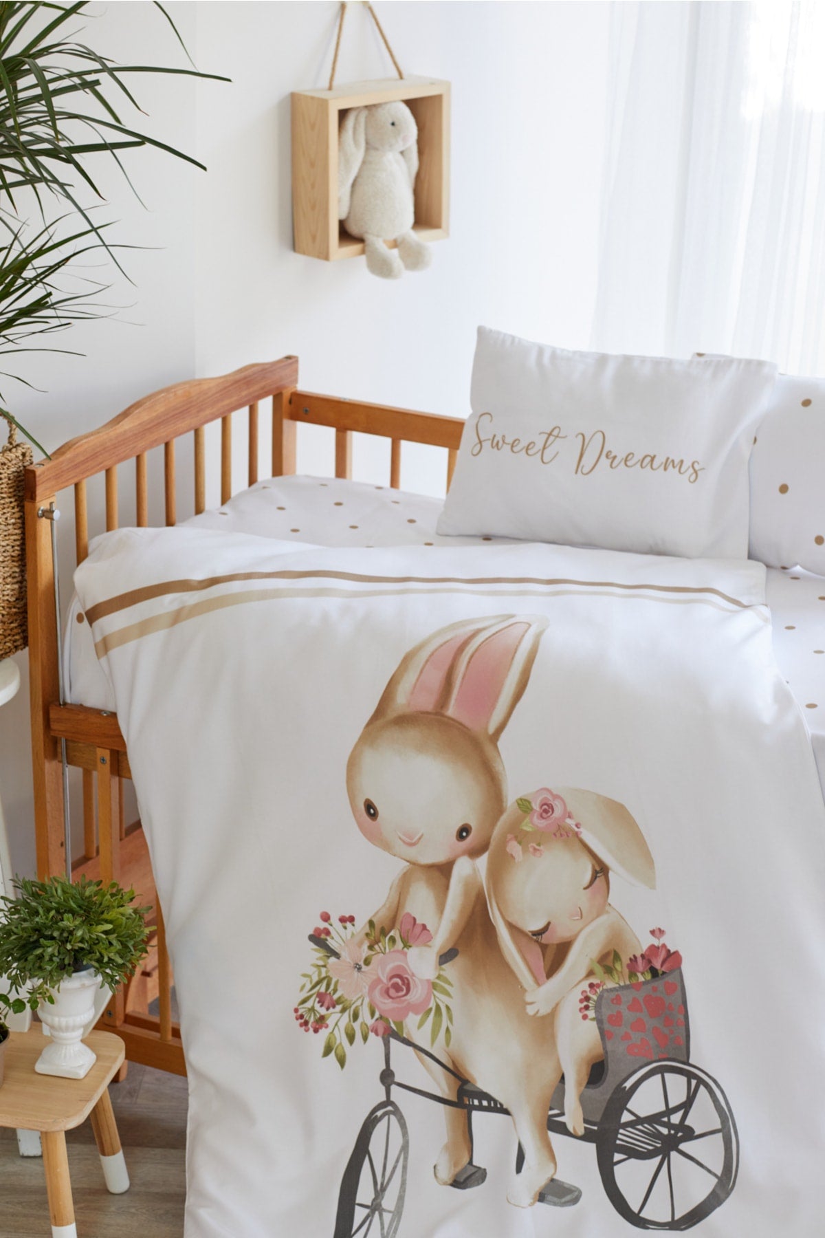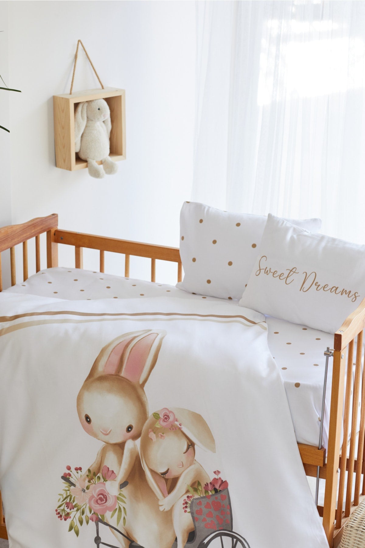 Organic Printed Cotton Satin Baby Duvet Cover Set - Polka Dot And Rabbit Themed