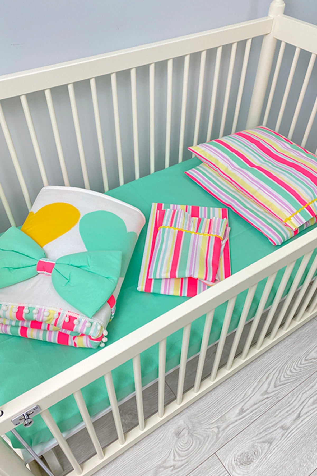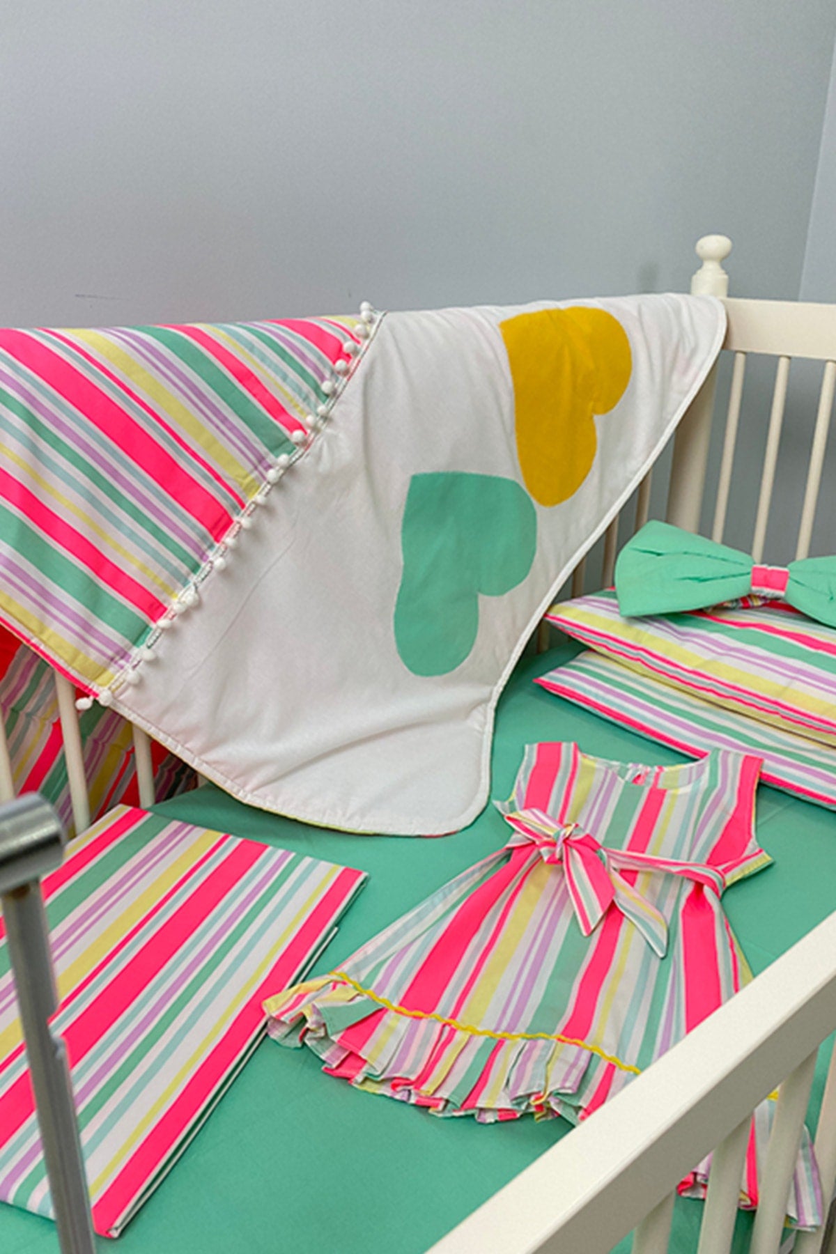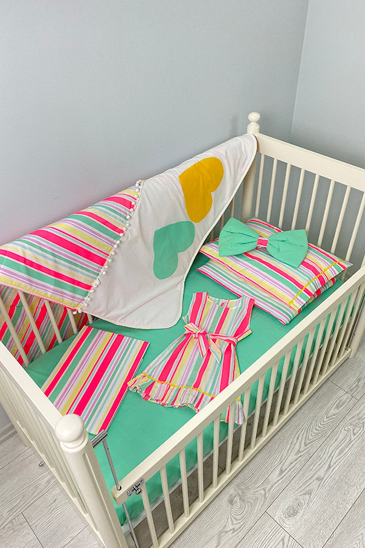 Stripe Patterned Turquoise Baby Duvet Cover Set, Quilt, Nightgown