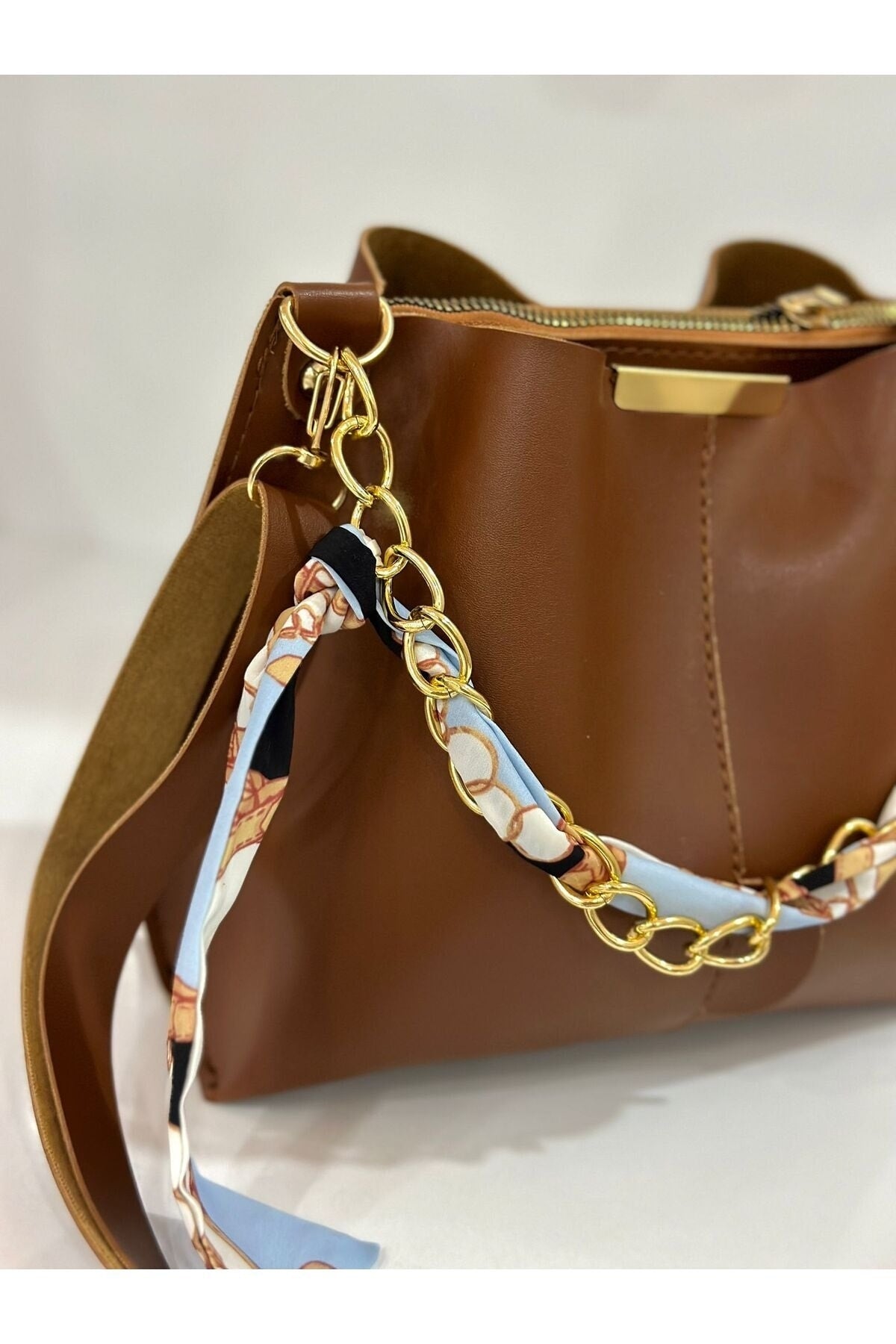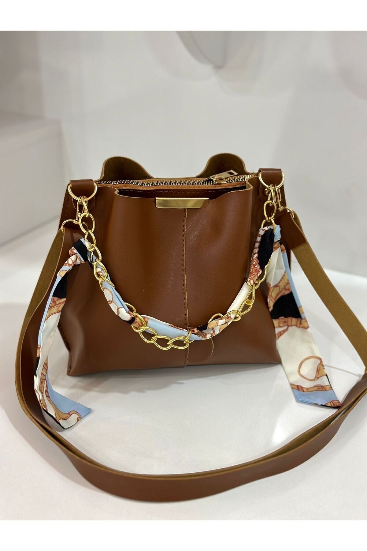 Women'S Tobacco Scarf Chain Accessory Soft Leather 3-Compartment Hand, Arm And Shoulder Bag