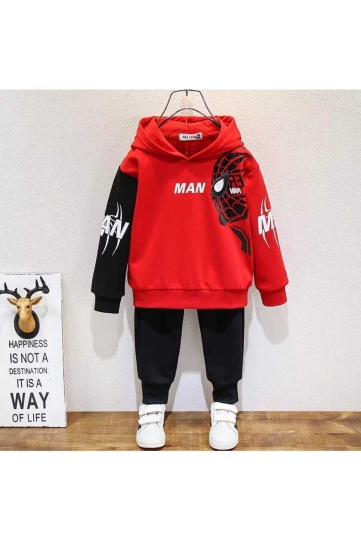 Boy Patterned Red Color Bottom Top 2-Pack Hooded Tracksuit Set