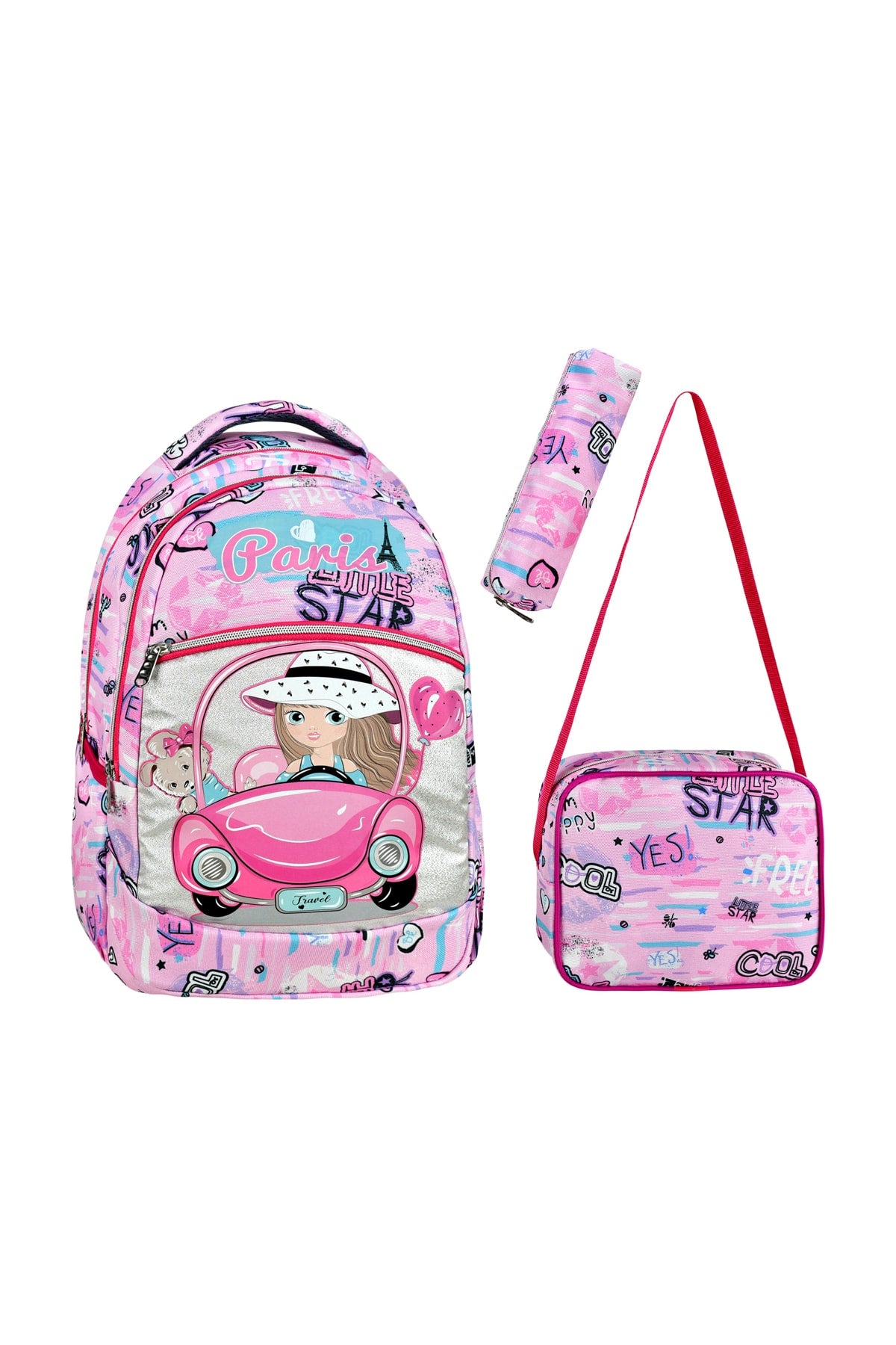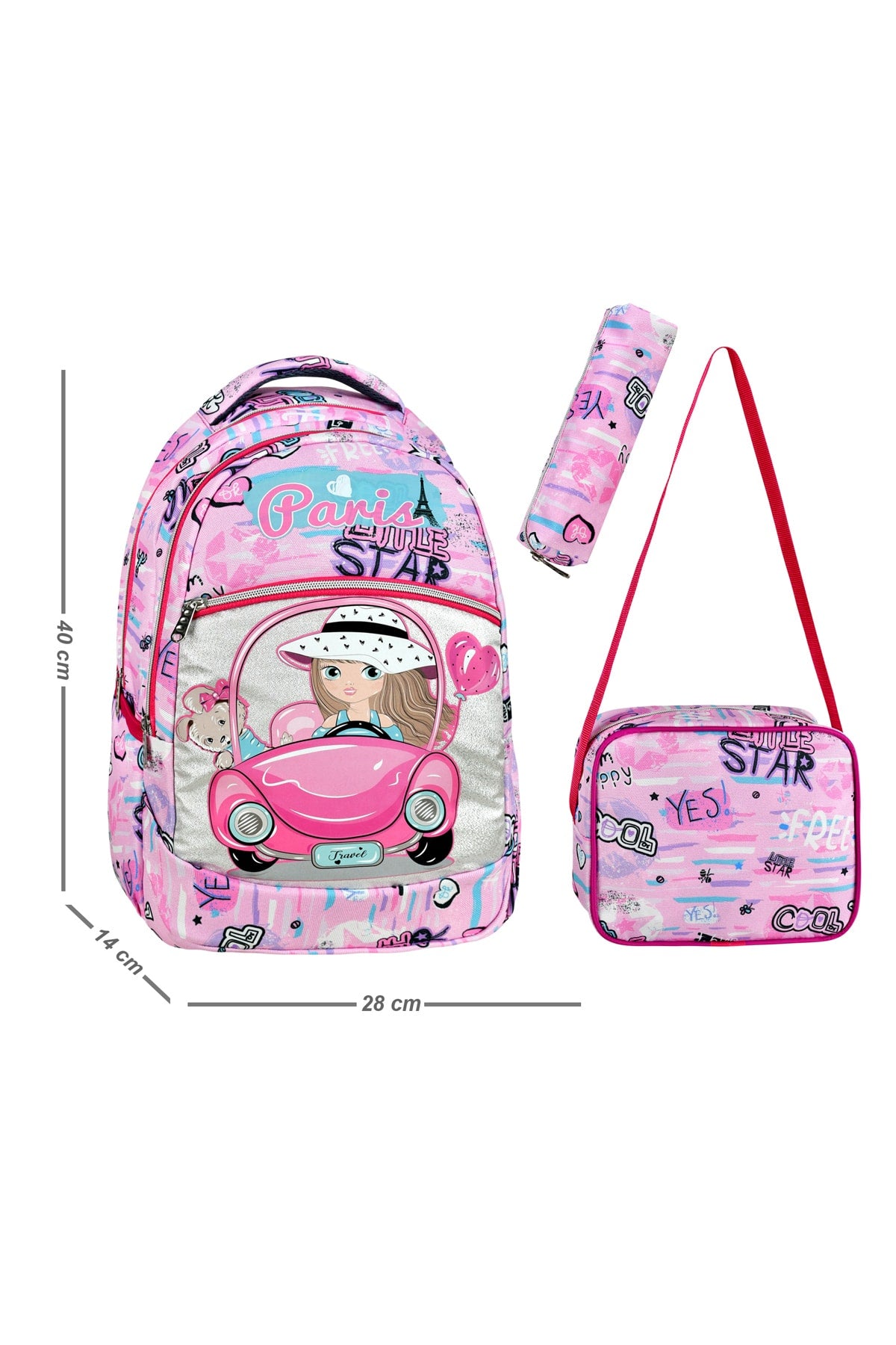 Set Of 3, Pink Color Girl Patterned Primary School Bag + Lunch Box + Pencil Holder