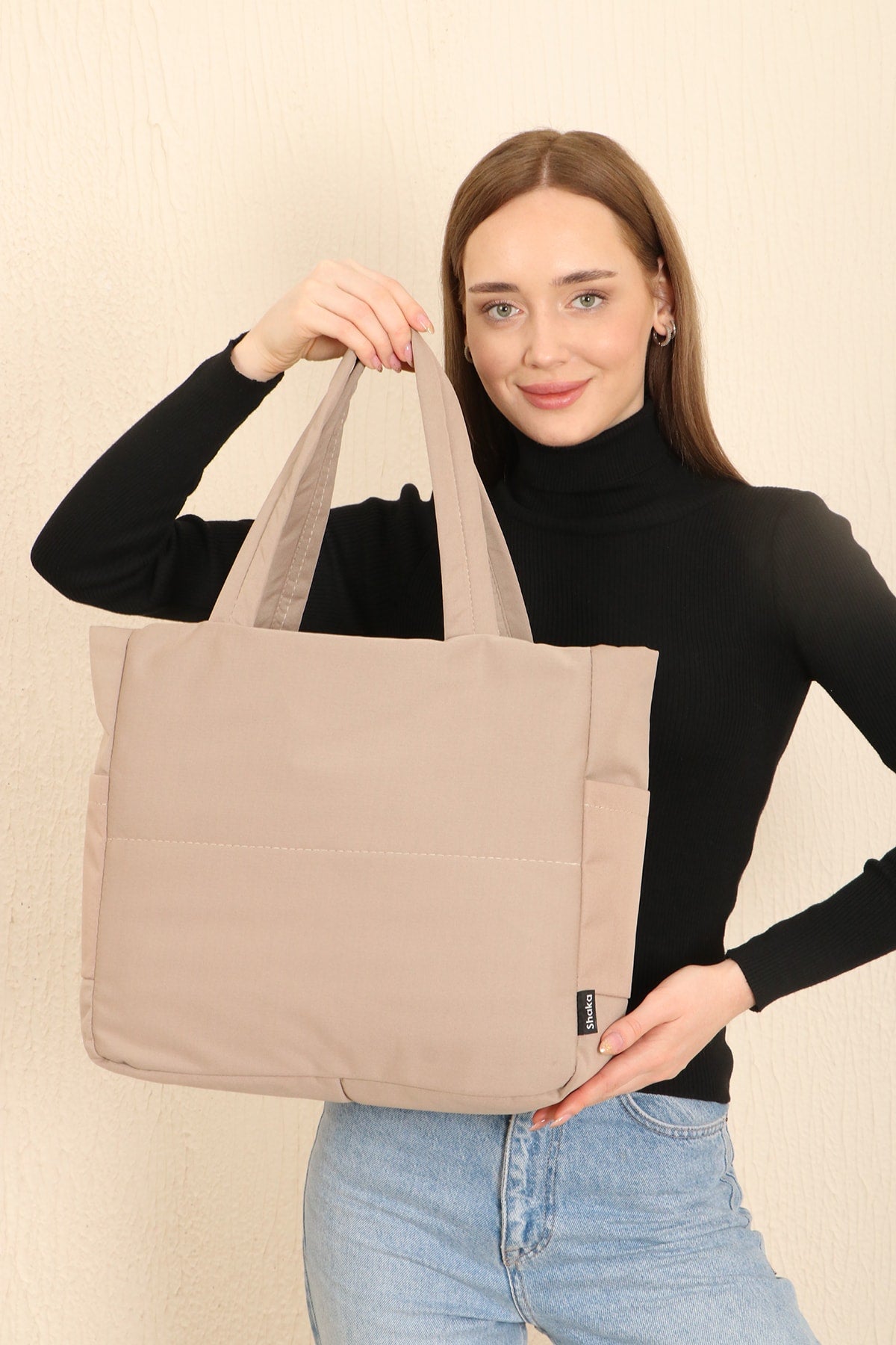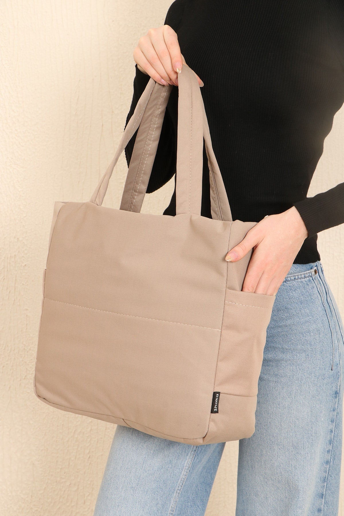 Beige U25 3-Compartment Side 2 Pocket Detailed Zipper Closure Canvas Women'S Arm And Shoulder Bag B:35 E:35 G:1
