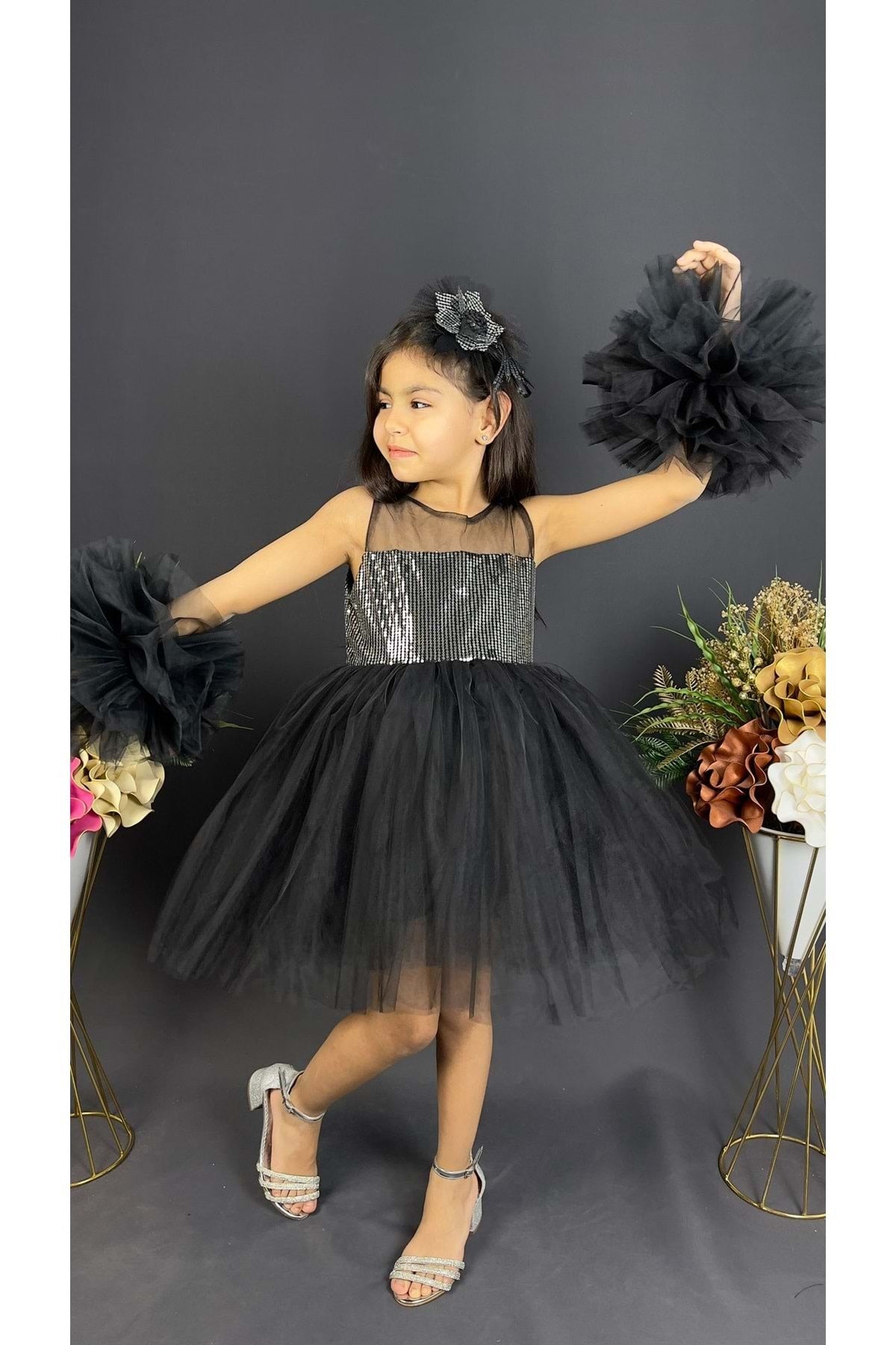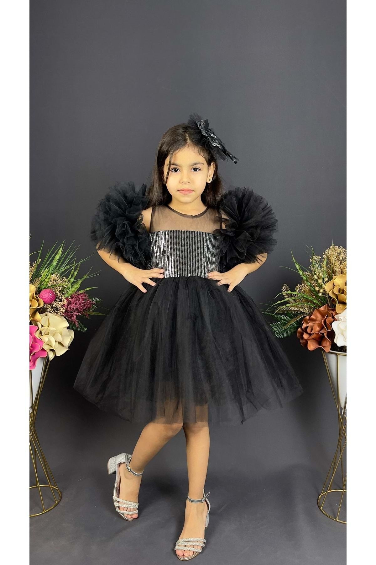 Chiffon Robe Pompom Sleeve Sequined Girls Fluffy Skirt Tulle Evening Dress Black - Gray