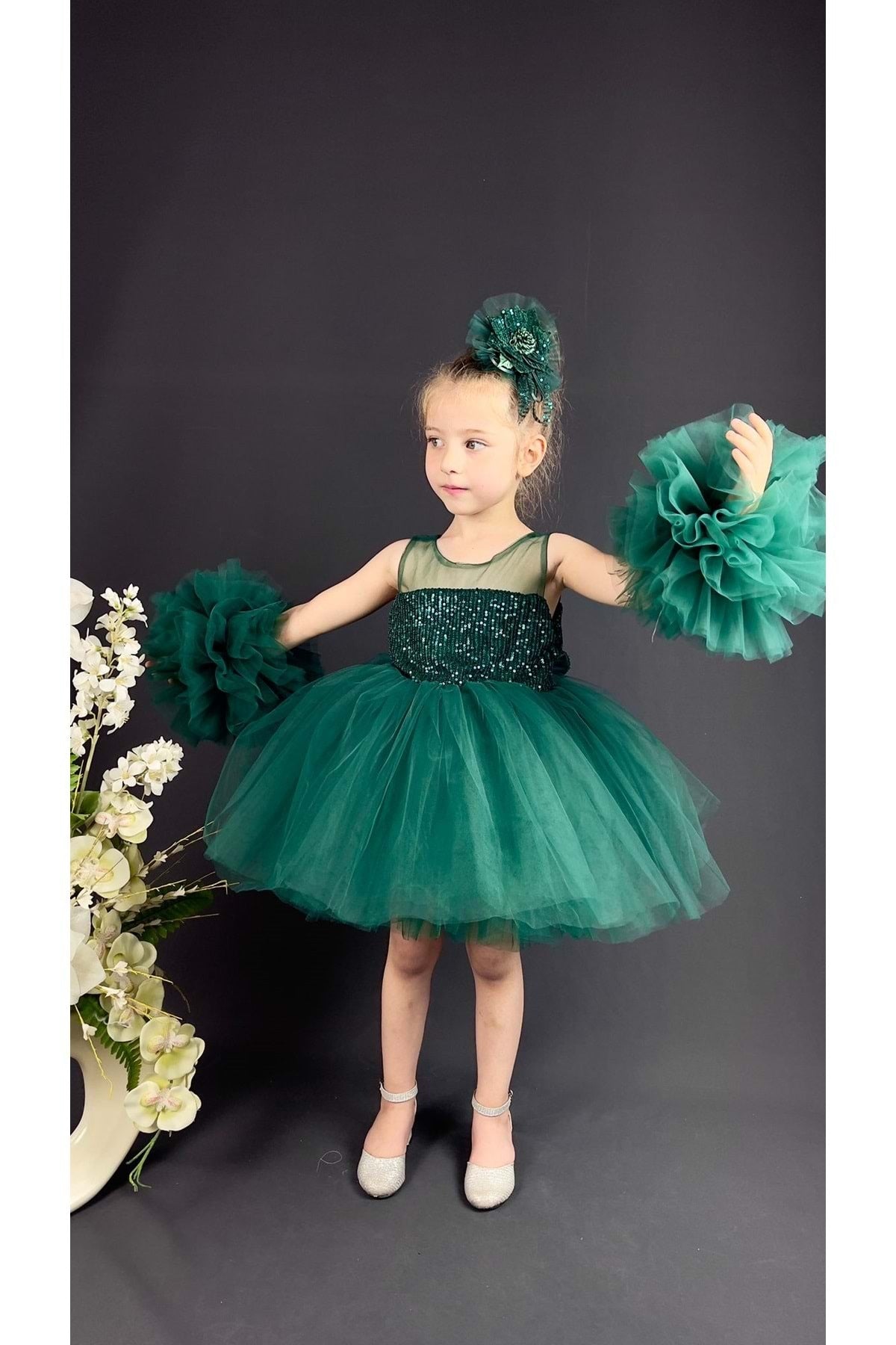 Chiffon Robe Pompom Sleeve Sequined Girls Fluffy Skirt Tulle Evening Dress Green