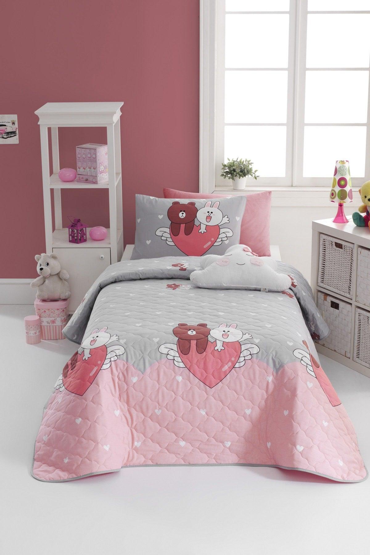 Комплект стеганого покрывала из 100% натурального хлопка Single Felices Серо-Розовый