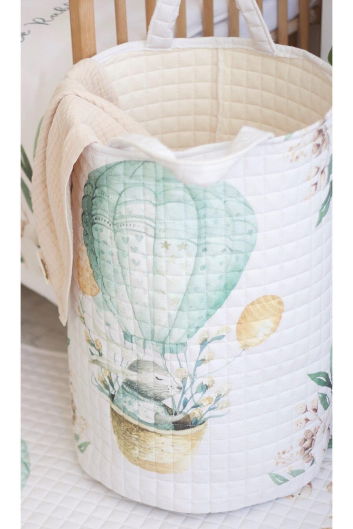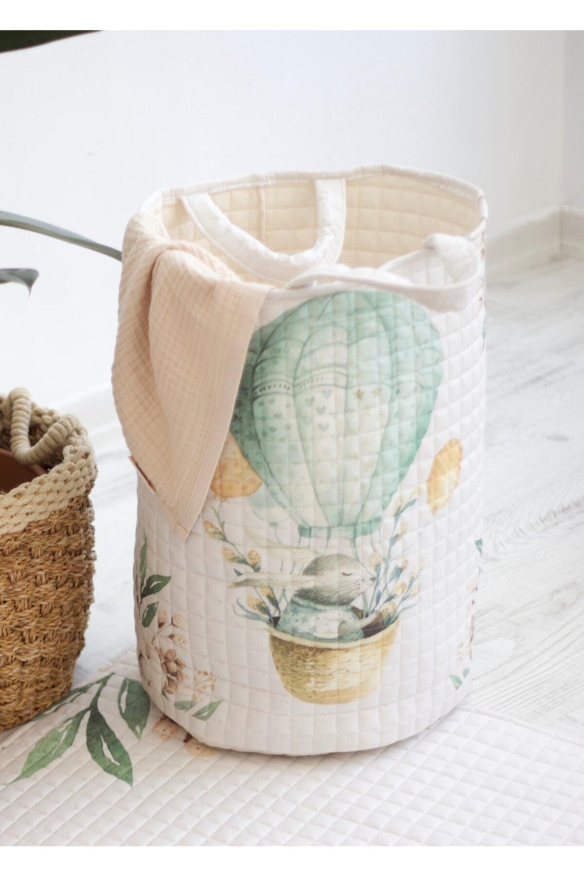 Детская игрушка из органического хлопка и корзина для белья - тематика летающего воздушного шара и кролика